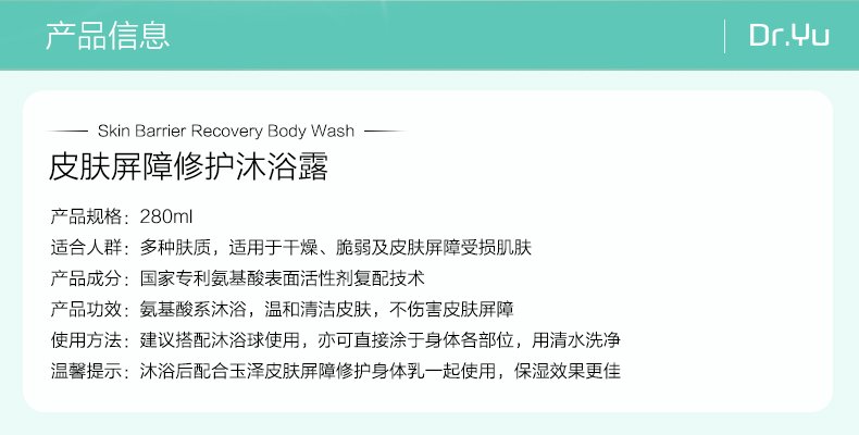商品名称:(汇景缘)(L)玉泽皮肤屏障修护沐浴露280ml 深层清洁补水保湿滋润