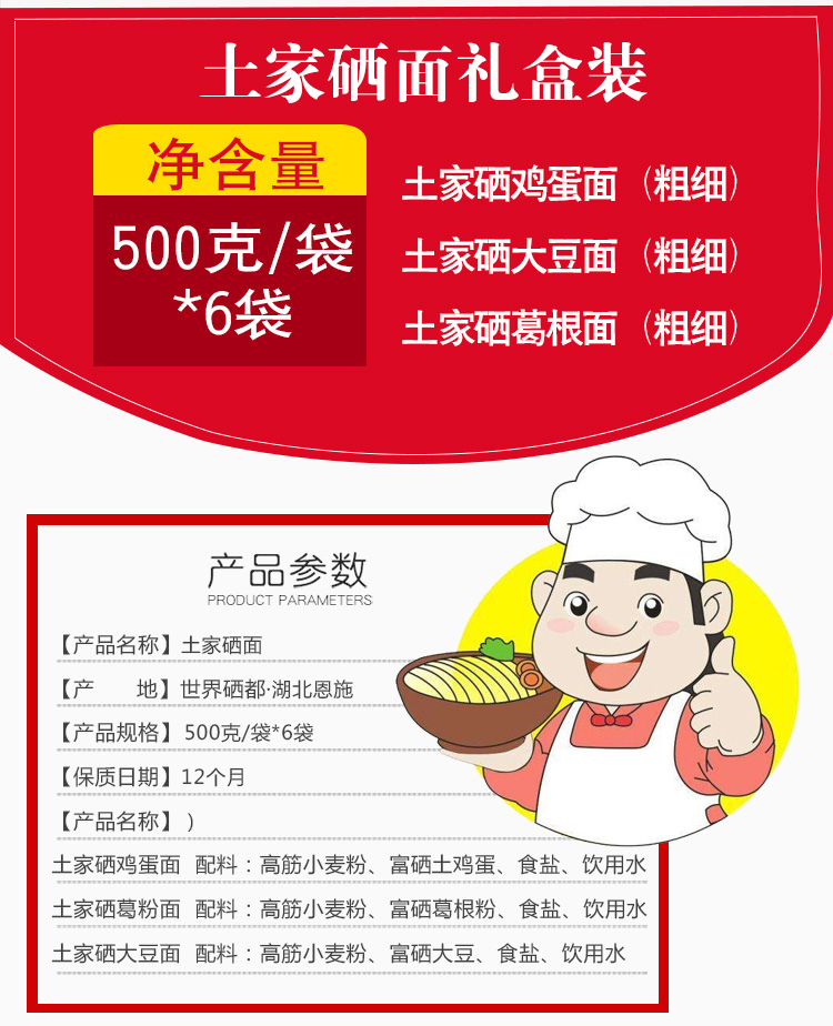 商品名称:(巨邦佑)BJ+龙凤坝土家硒面礼盒500g*6 富硒面鸡蛋葛粉大豆面条