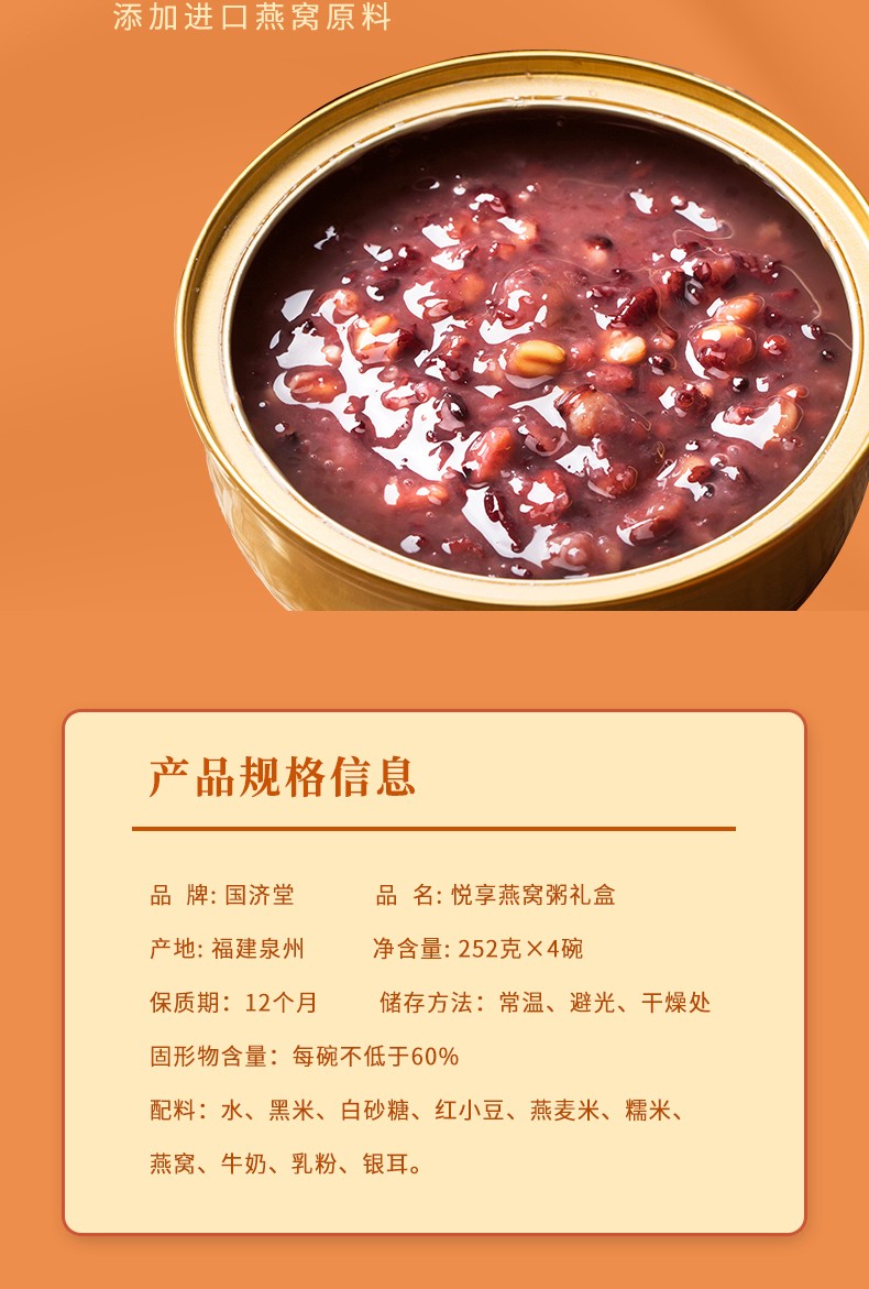 商品名称:(世星阳光) 国济堂.悦享燕窝粥(4碗装 252g*4)送礼早餐成人儿童孕妇速食营养粥