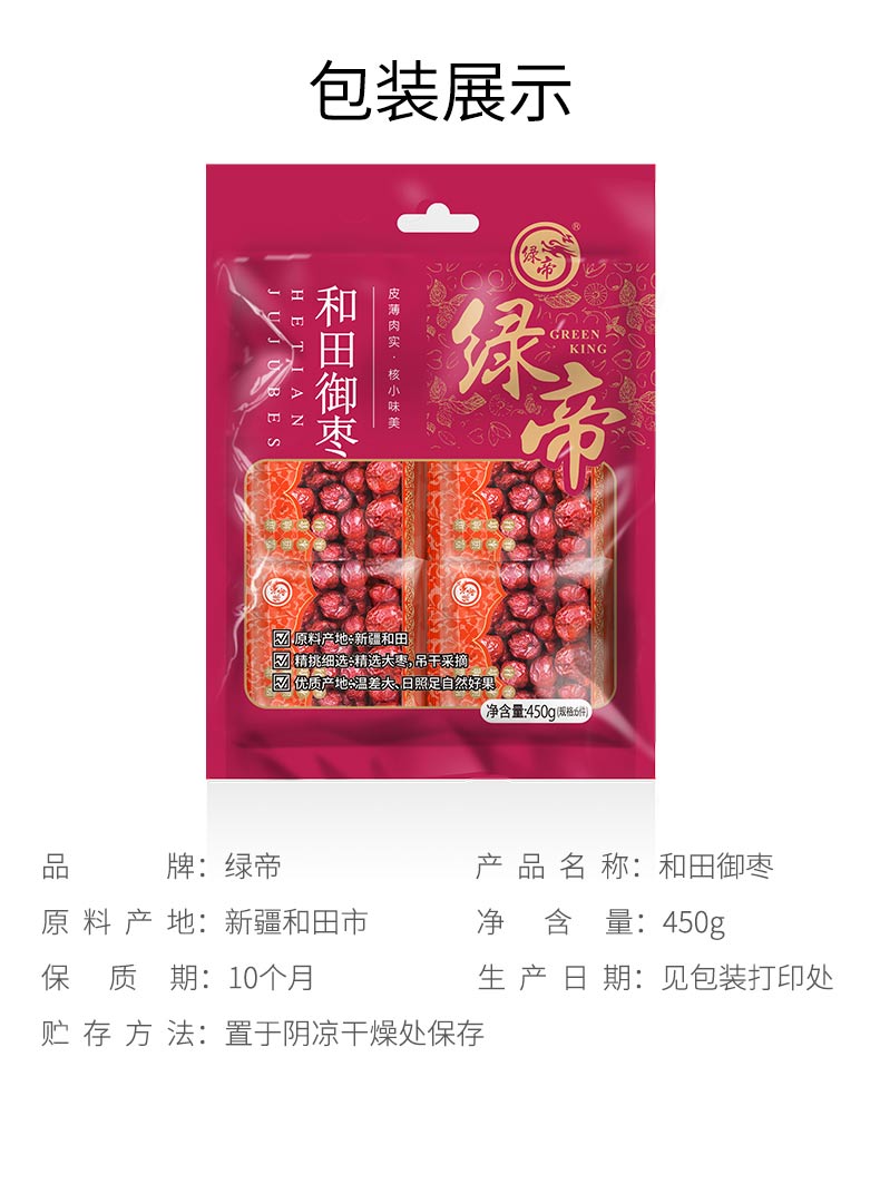 商品名称:(世星阳光)绿帝和田御枣450g(袋) 南北干货 干红枣 和田 御 枣袋装居家独立包装