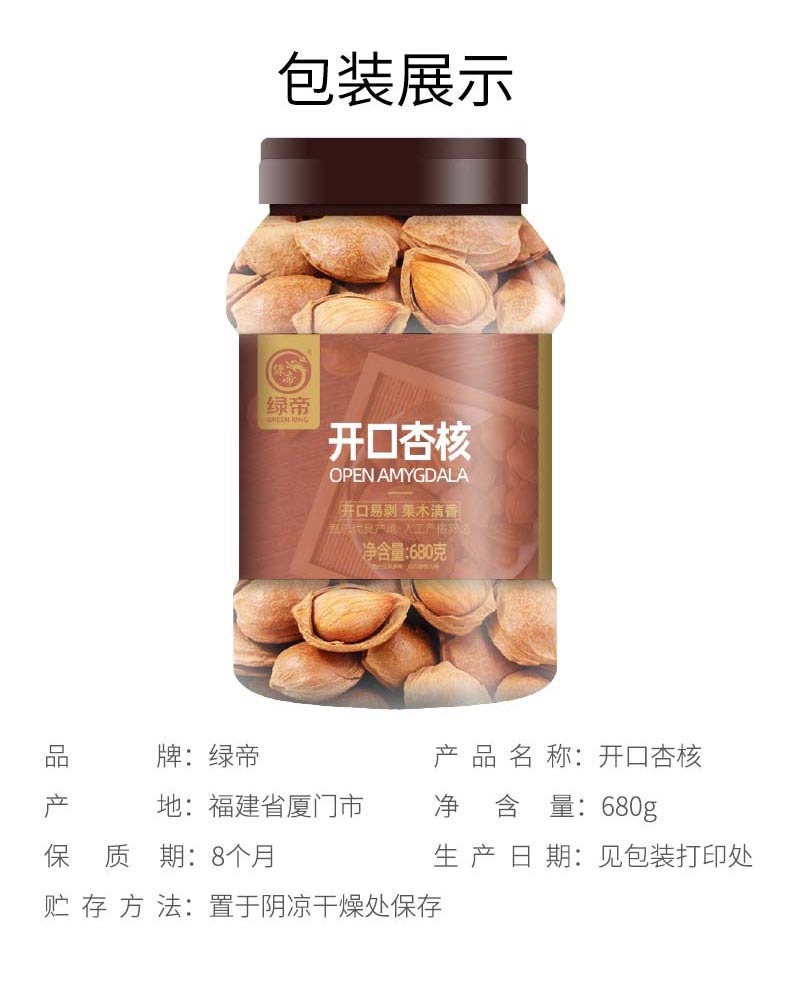 商品名称:(世星阳光)绿帝开口杏核680g 每日坚果炒货休闲零食