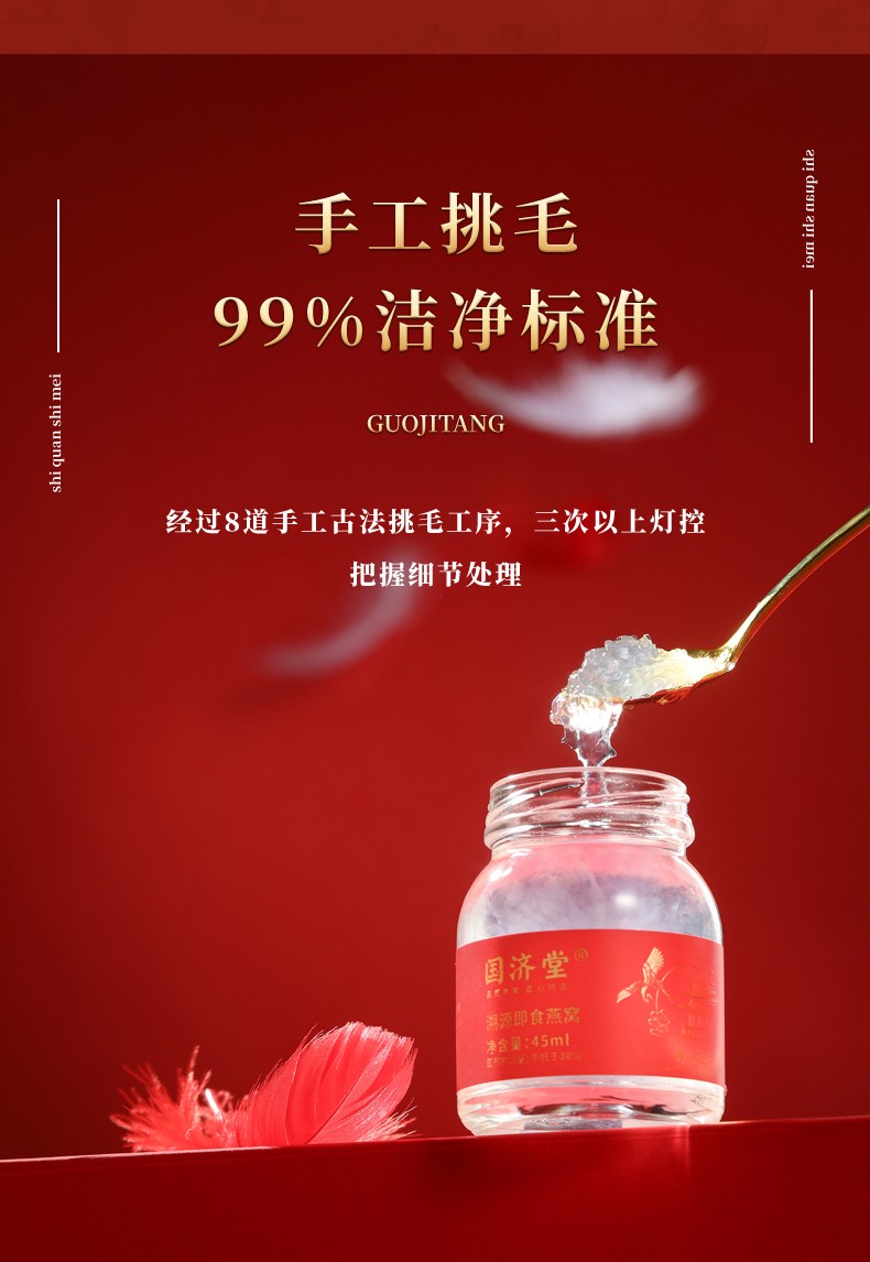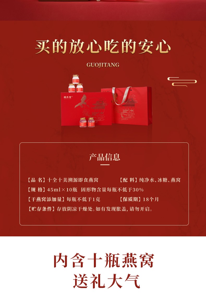 商品名称:(世星阳光) 国济堂 十全十美溯源即食燕窝礼盒(45g*10)女性孕妇老人健康礼 清甜无腥,手工挑毛,无添加剂