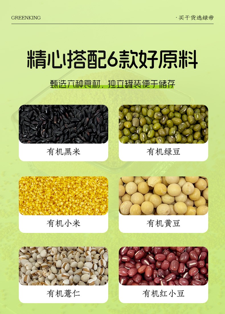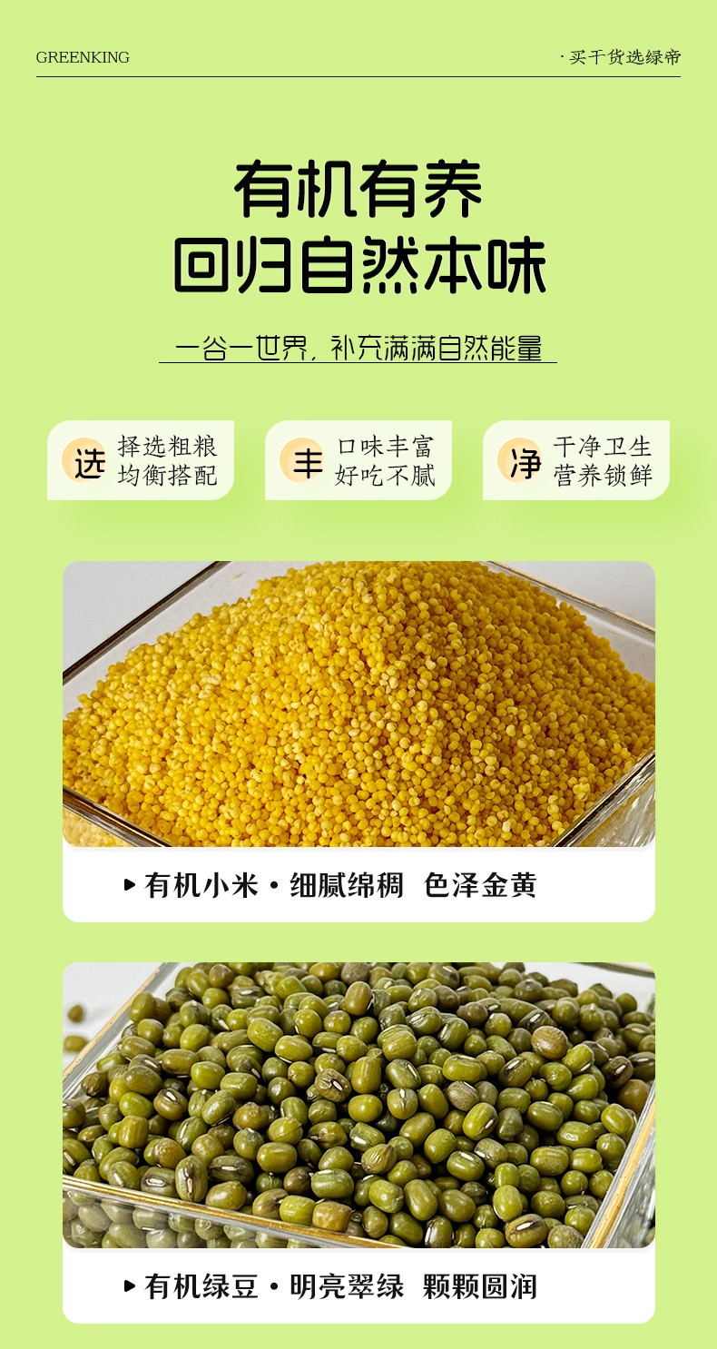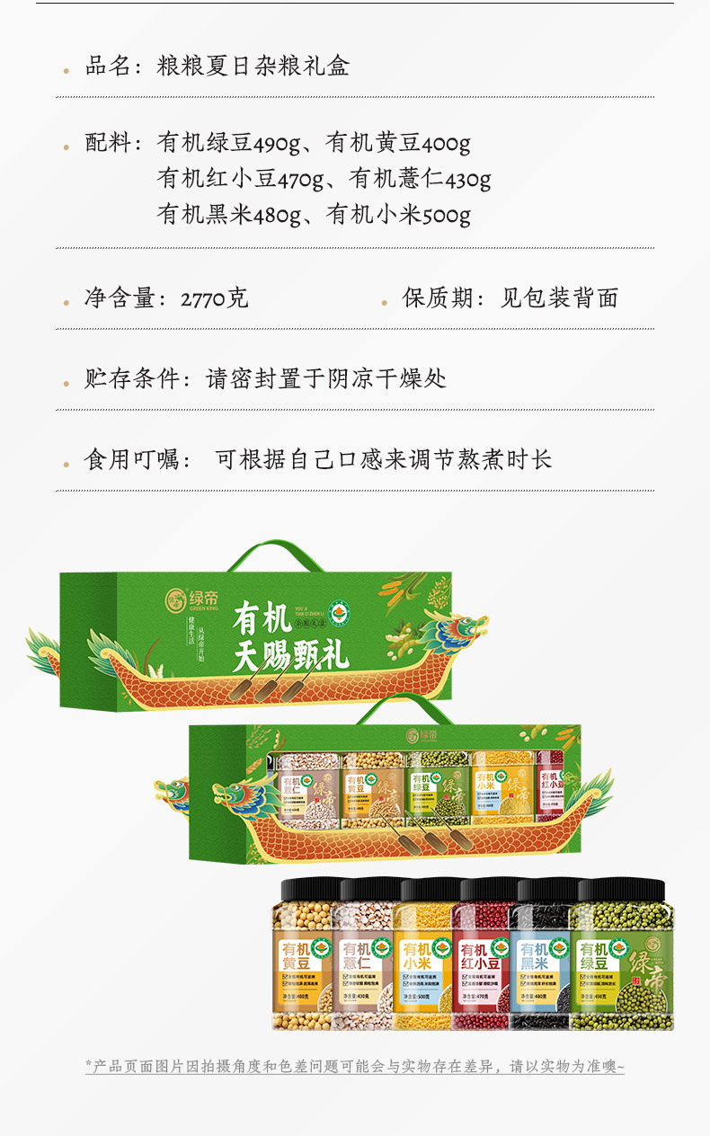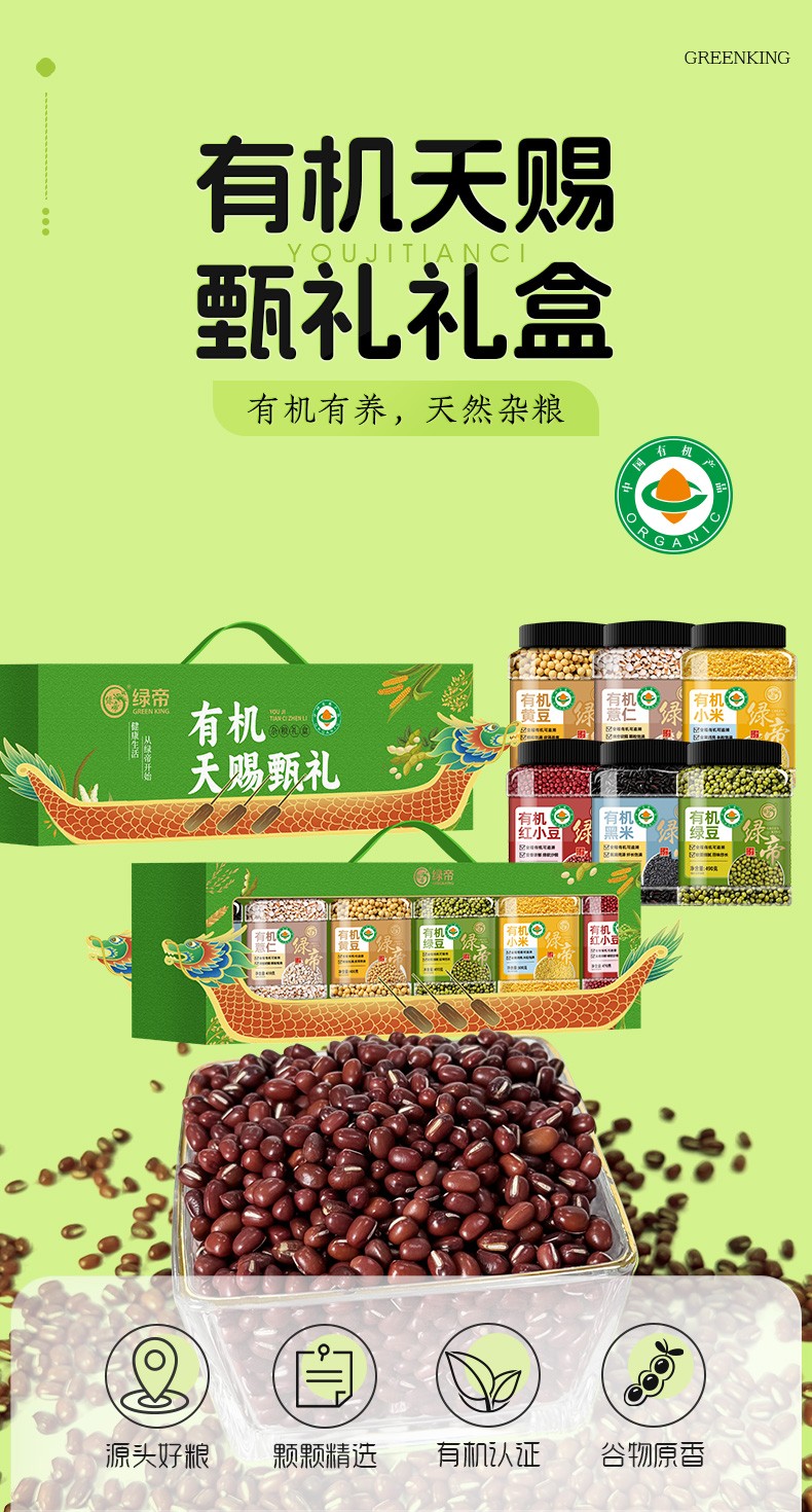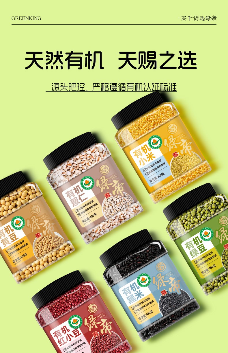 商品名称:(巨邦佑)T+绿帝有机天赐甄礼杂粮礼盒2.77kg(有机绿豆490g、有机小米500g、有机红小豆470g、有机薏仁430g、有机黑米480g、有机黄豆400g)