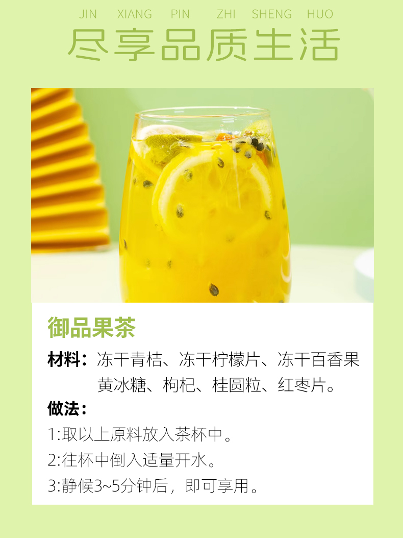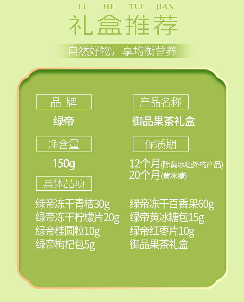商品名称:(巨邦佑)T+绿帝御品果茶礼盒150g(冻干柠檬片20g、冻干青桔30g、冻干百香果60g 、迷你甜40g)