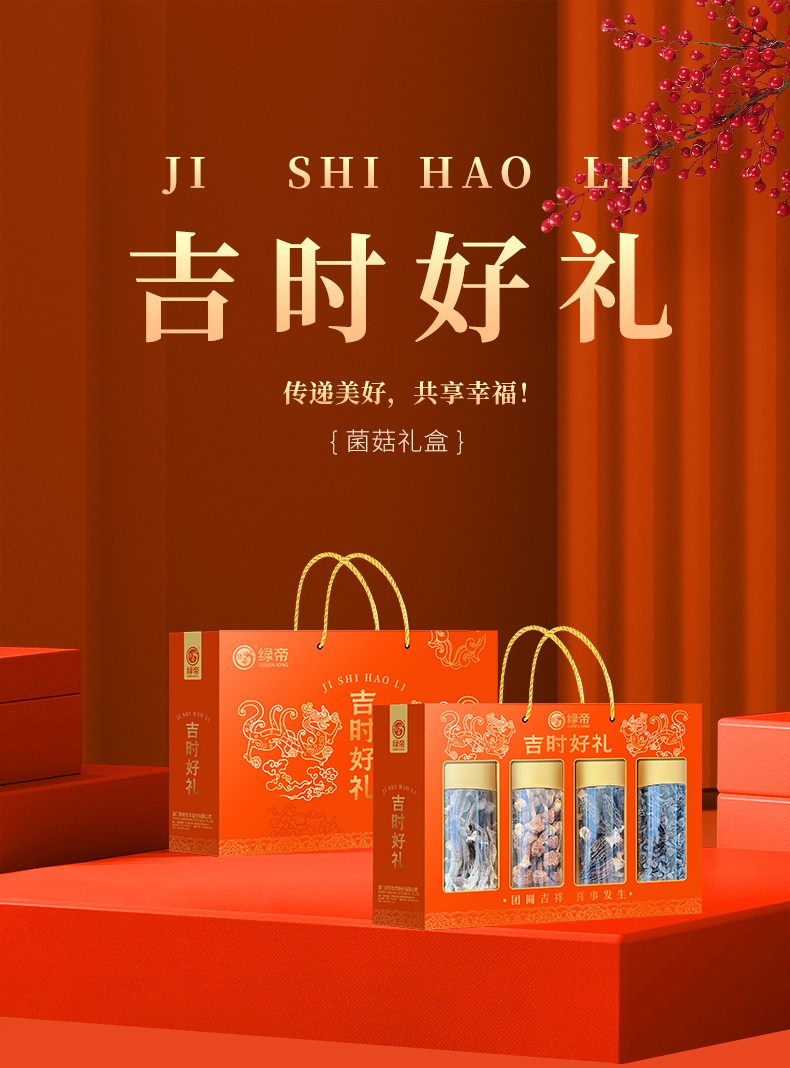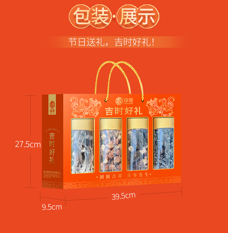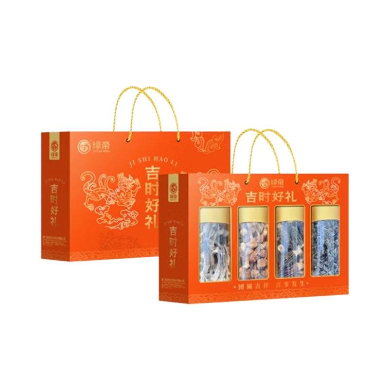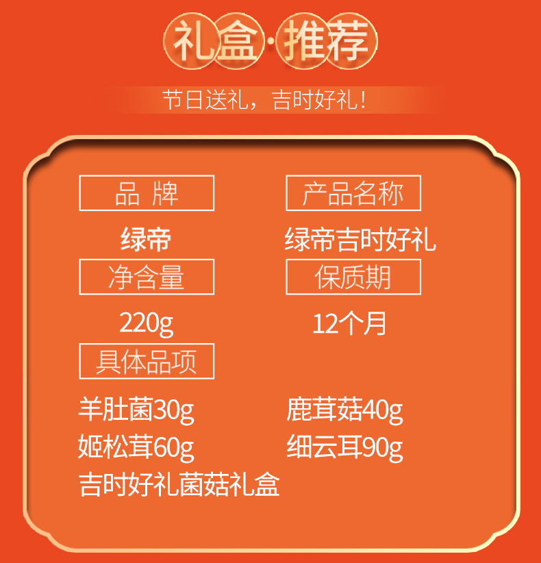 商品名称:(巨邦佑)T+绿帝吉时好礼菌菇礼盒220g(鹿茸菇40g、羊肚菌30g、姬松茸60g、细云耳90g)