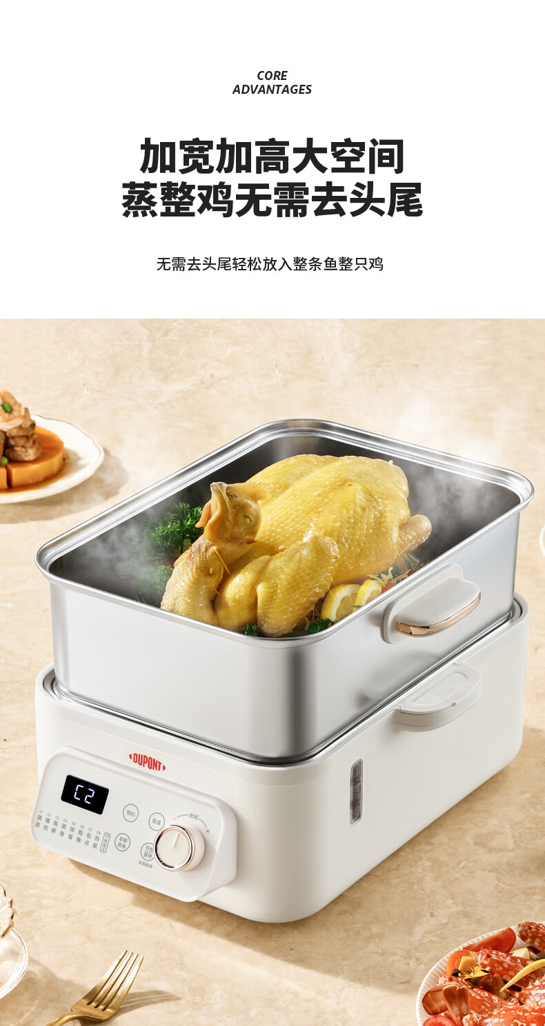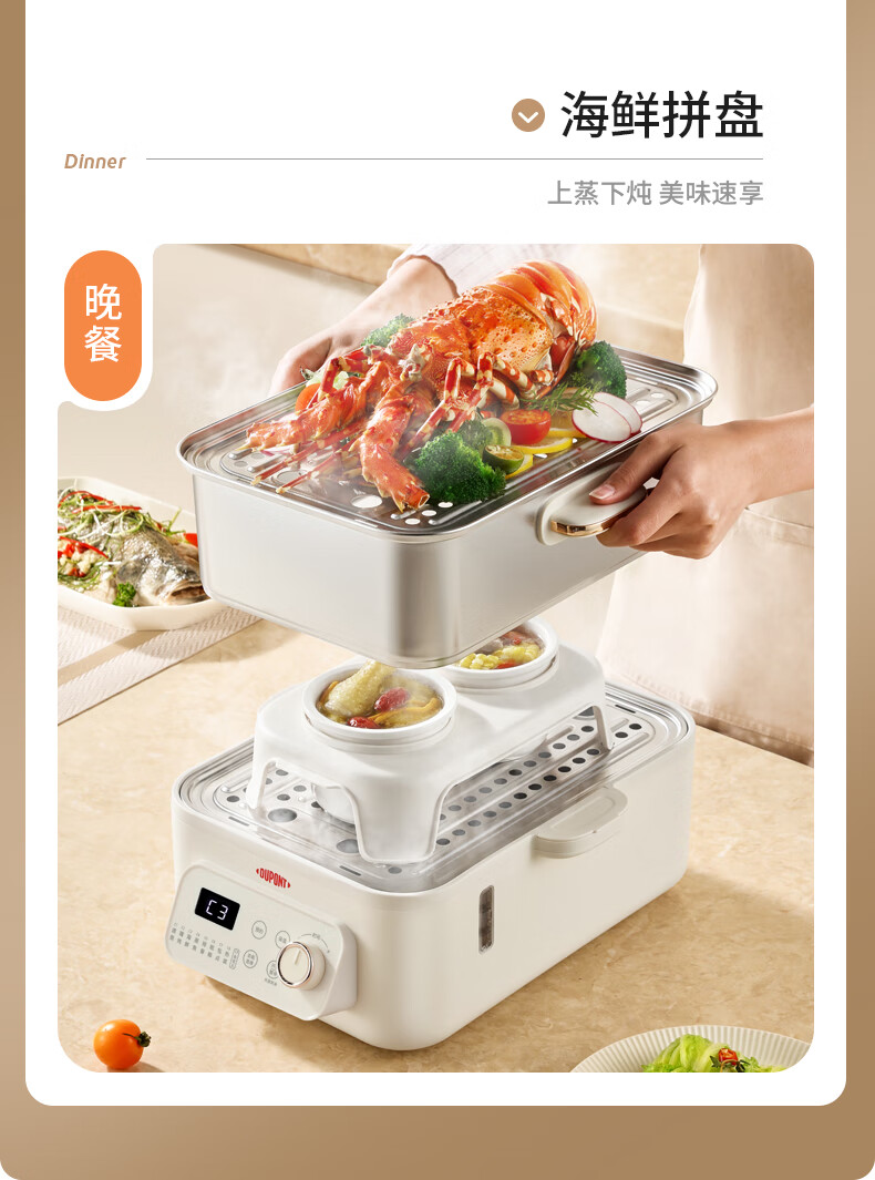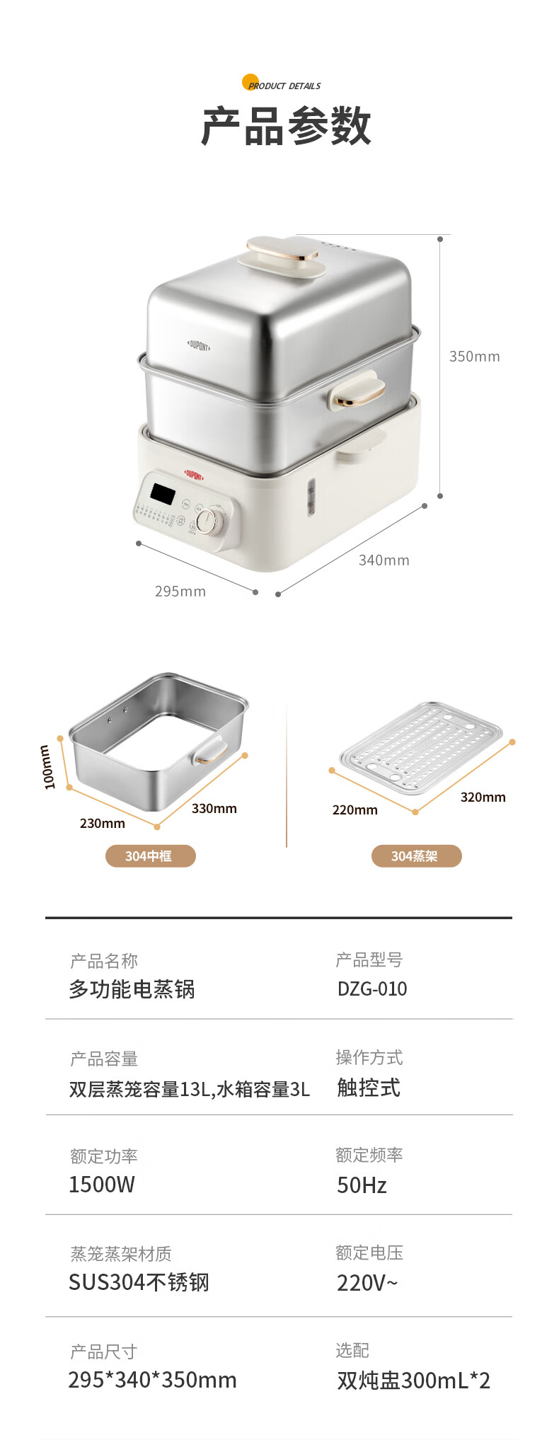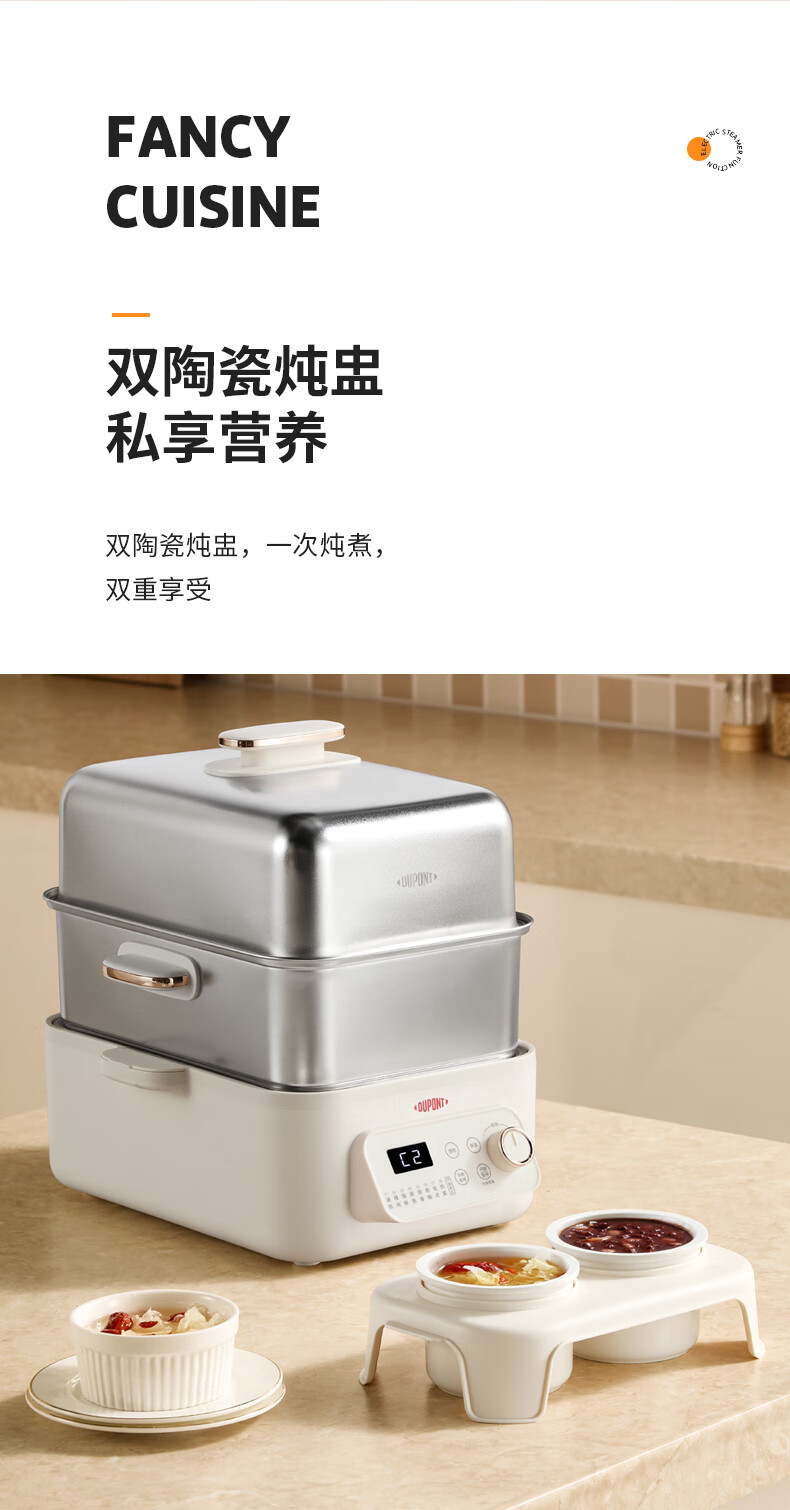 商品名称:(巨邦佑)BJ+杜邦不锈钢多功能电蒸锅DZG-010 2层/3层 带炖盅定制鱼盘 大容量多功能蒸汽锅自动断电智能预约快速蒸汽0涂层精钢隔水炖