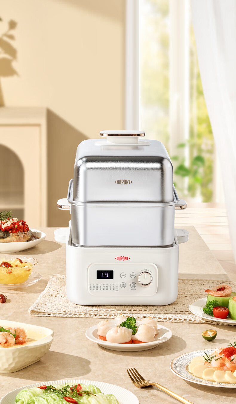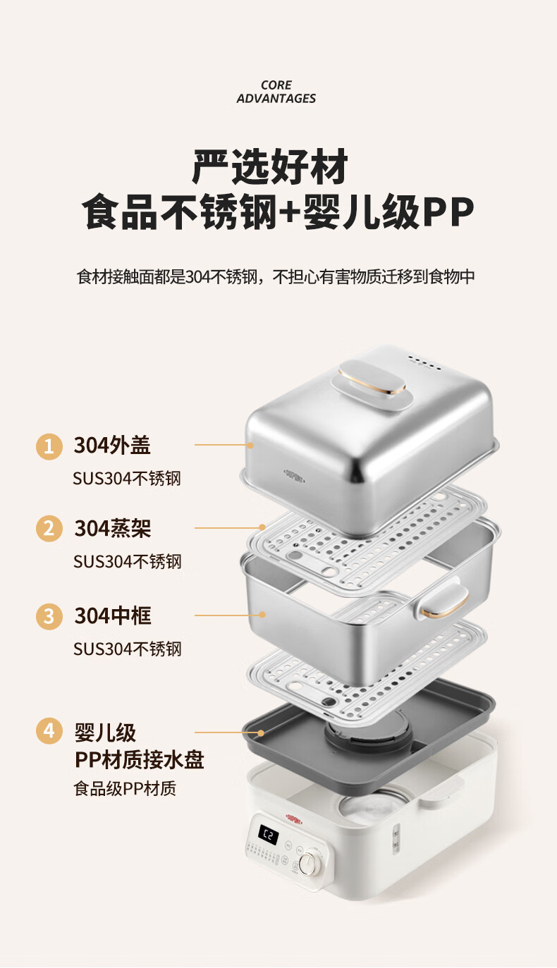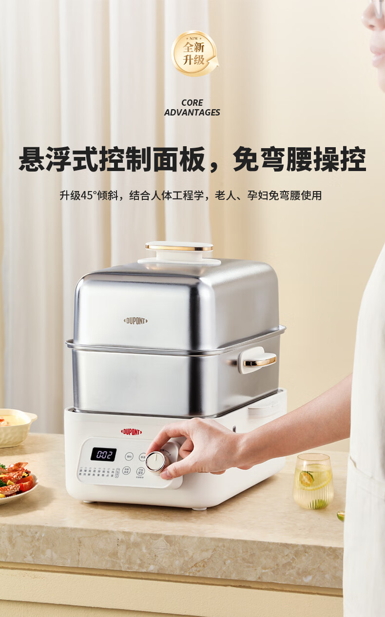 (巨邦佑)BJ+杜邦不锈钢多功能电蒸锅DZG-010 2层/3层 带炖盅定制鱼盘 大容量多功能蒸汽锅自动断电智能预约快速蒸汽0涂层精钢隔水炖