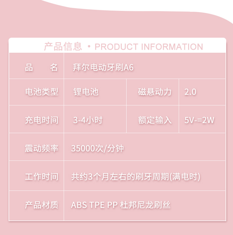 商品名称:(世星阳光) 拜尔电动牙刷A6(含2只原装刷头)充电式 成人声波 电动牙刷