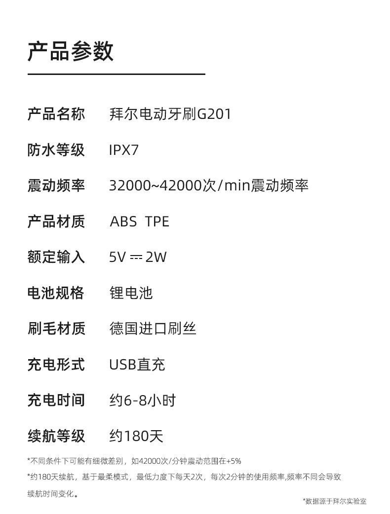 商品名称:(世星阳光) 拜尔 声波式锂电池充电式成人电动牙刷 G201 (原配刷头6只、旅行盒一个)电动牙刷声波成人学生情侣自动震动男士女送男朋友礼盒装