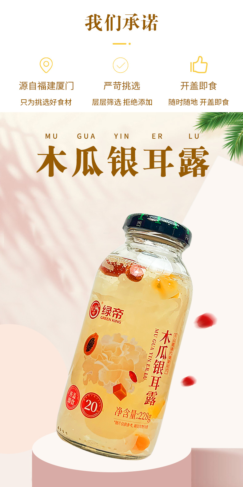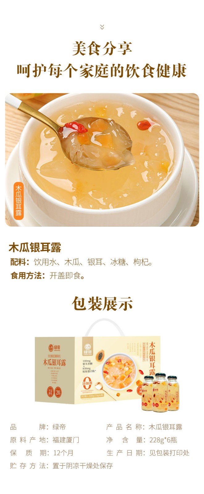 商品名称:(世星阳光) 绿帝木瓜银耳露1.368kg(228g*6瓶)0添加0脂肪