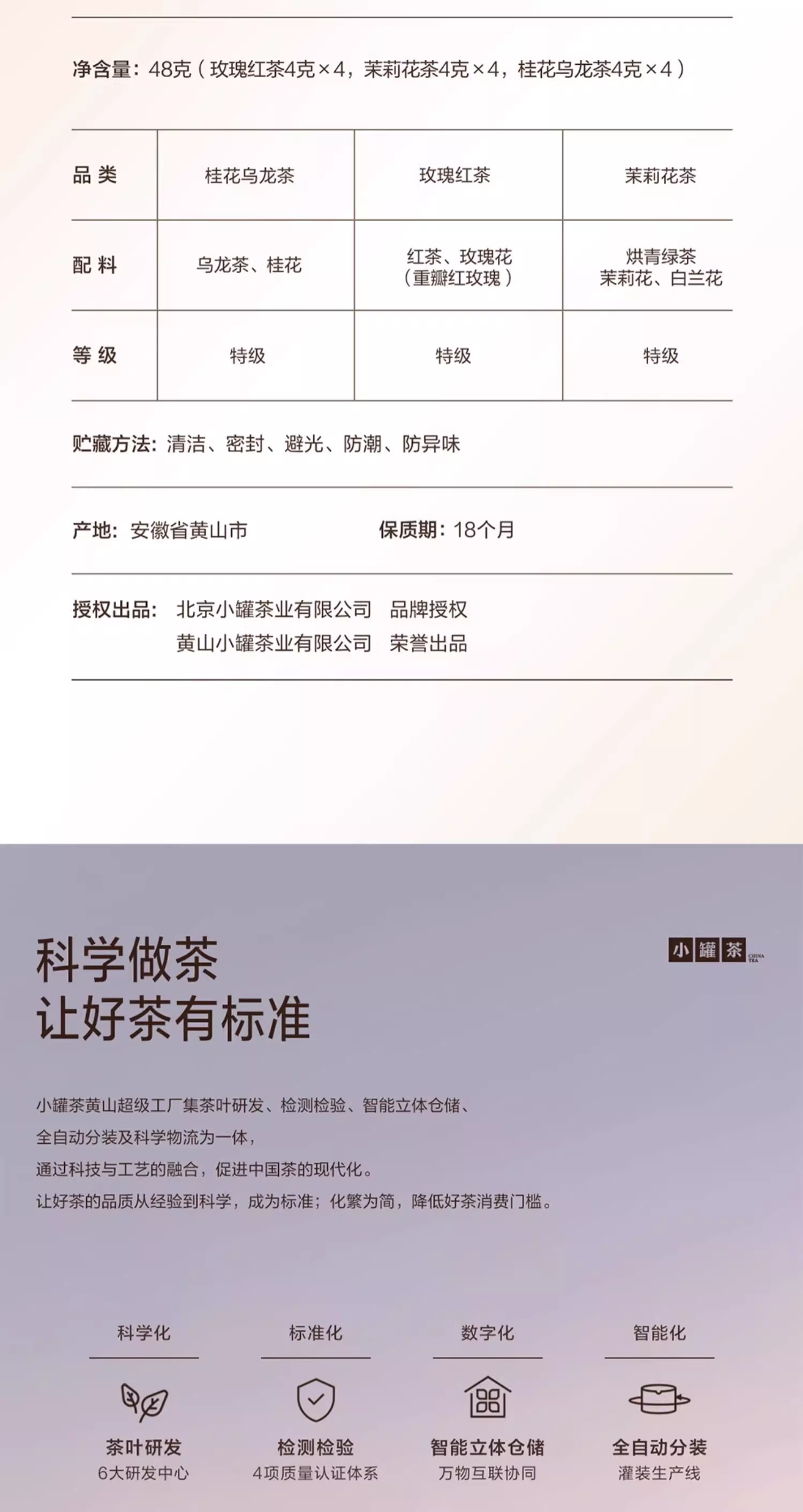 商品名称:(超运·禾贸)小罐茶花开锦时·窨制花茶组合茶48g(桂花乌龙茶4g*4,玫瑰红茶4g*4,茉莉花茶4g*4) 等级:特级