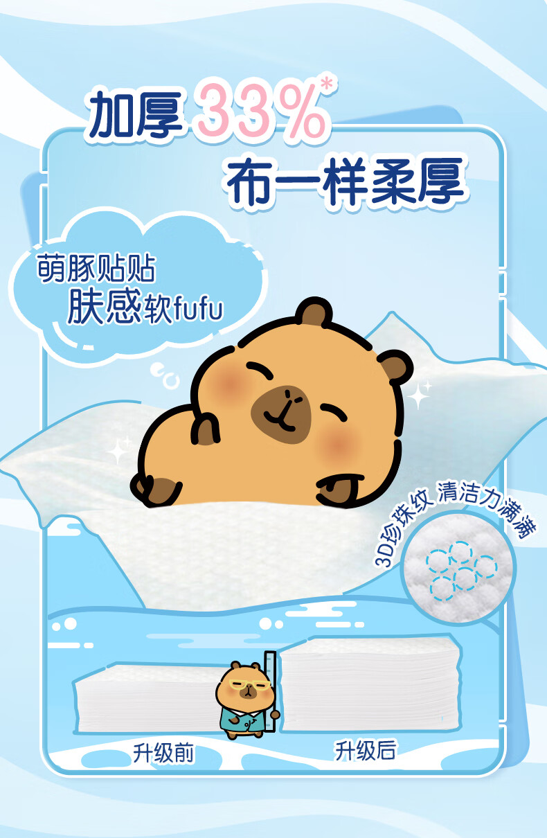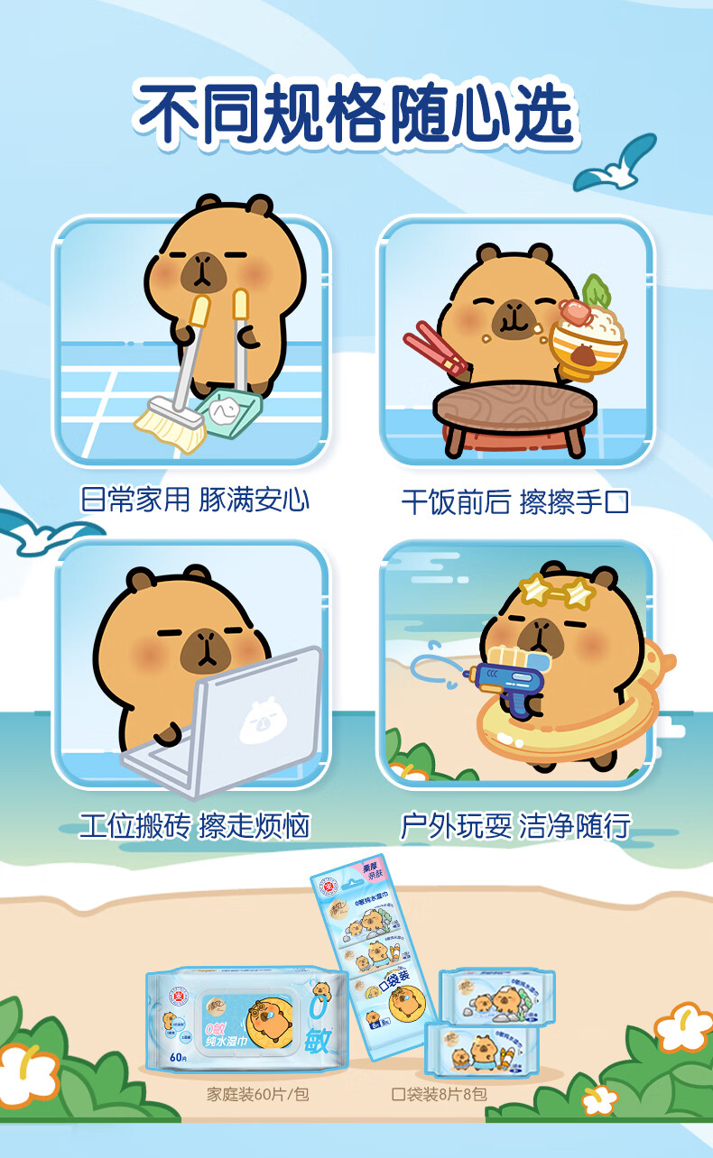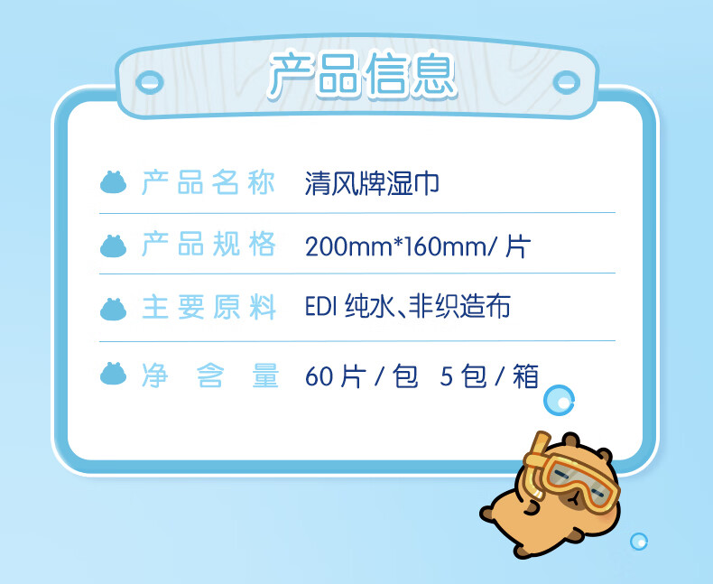 商品名称:(超运·禾贸)清风卡皮巴拉IP纯水1层60片包*1*5湿纸巾【51011483】 敏感肌用