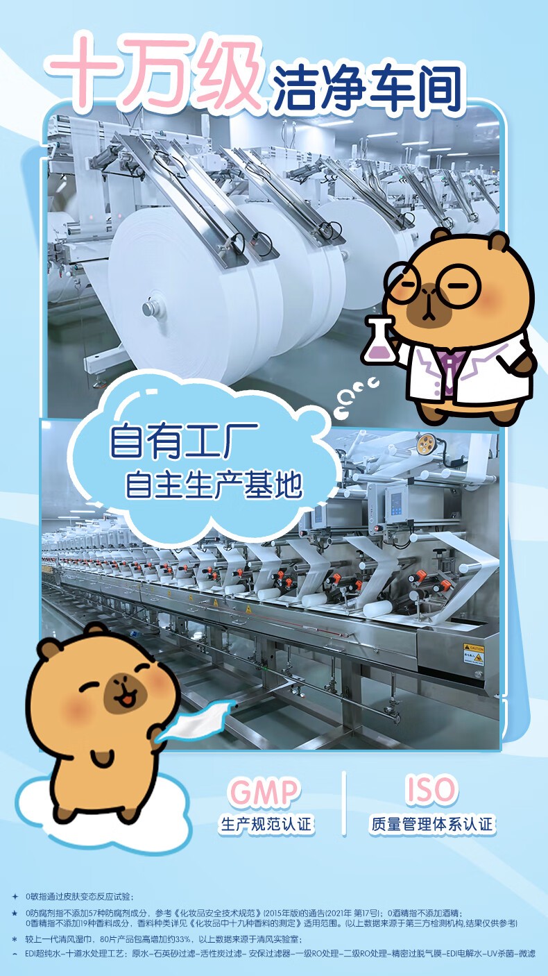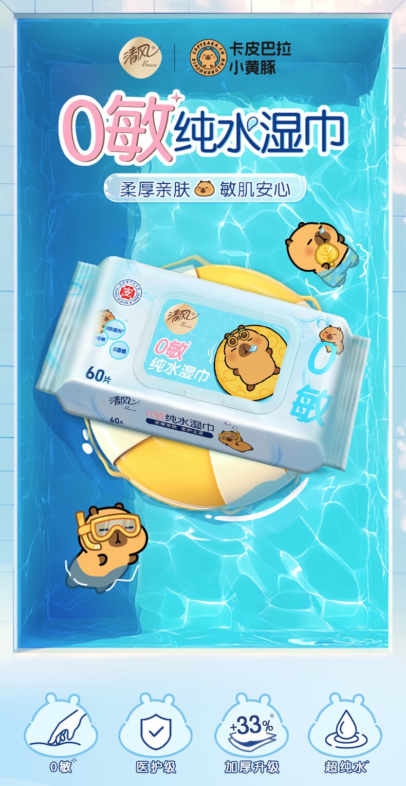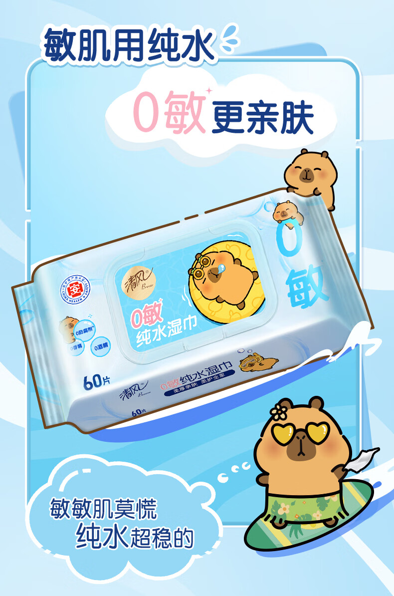 (超运·禾贸)清风卡皮巴拉IP纯水1层60片包*1*5湿纸巾【51011483】 敏感肌用