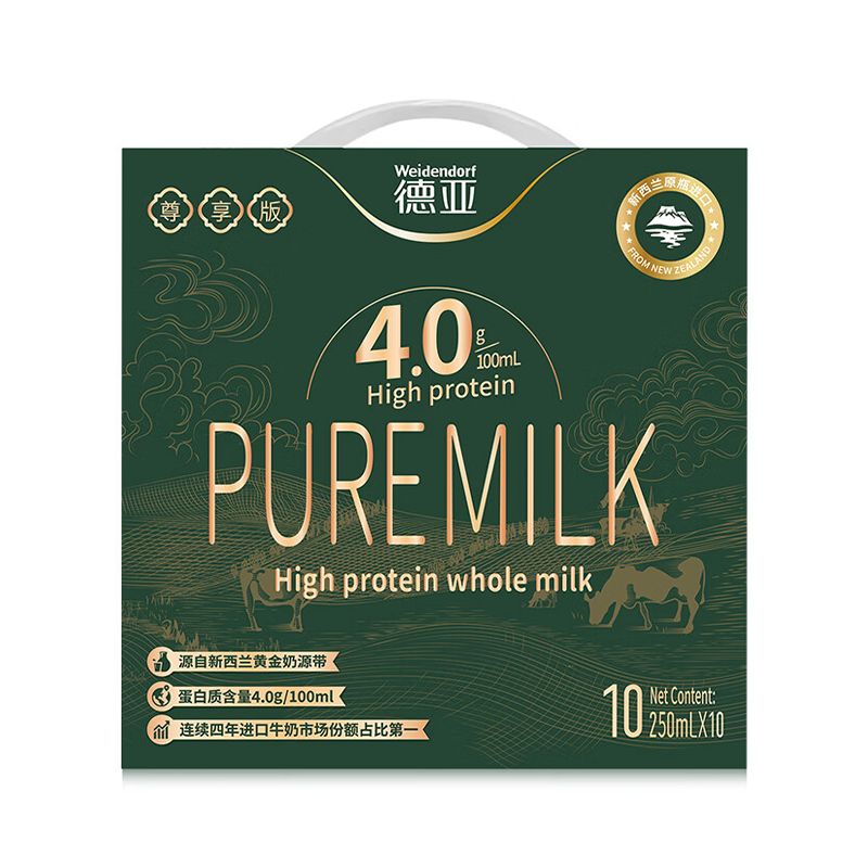 商品名称:(汇景缘)(F)德亚4.0g全脂牛奶250*10礼盒(尊享版)黄金奶源带系列进口纯牛奶营养早餐高端礼盒