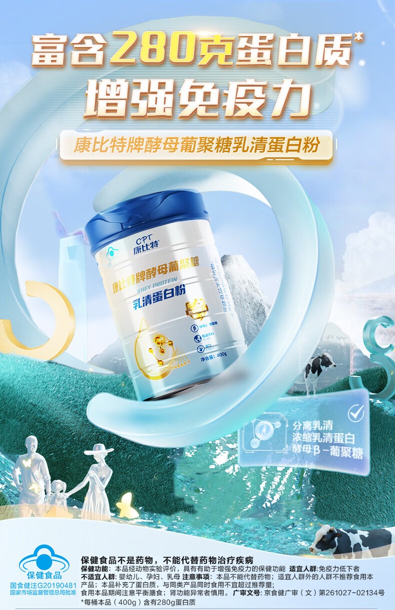 (巨邦佑)BJ+康比特 酵母葡聚糖乳清蛋白粉400g(赠摇杯) 中老年人增强免疫力补充营养酵母葡聚糖100%动物蛋白