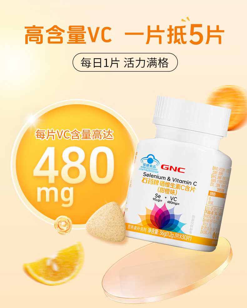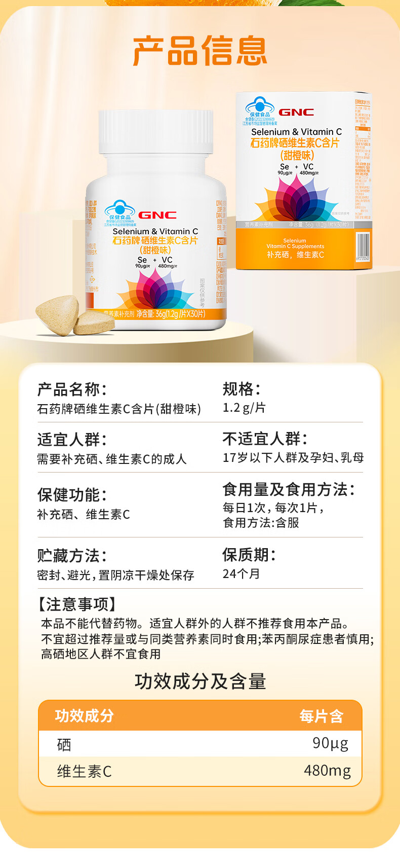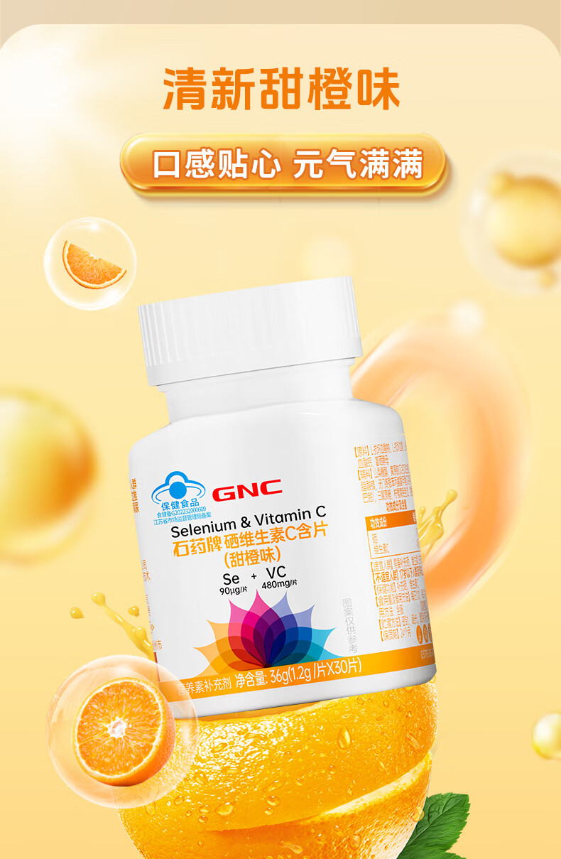 商品名称:(巨邦佑)BJ+GNC健安喜 硒维生素C含片(甜橙味)30片 17岁以上成人补充硒VC