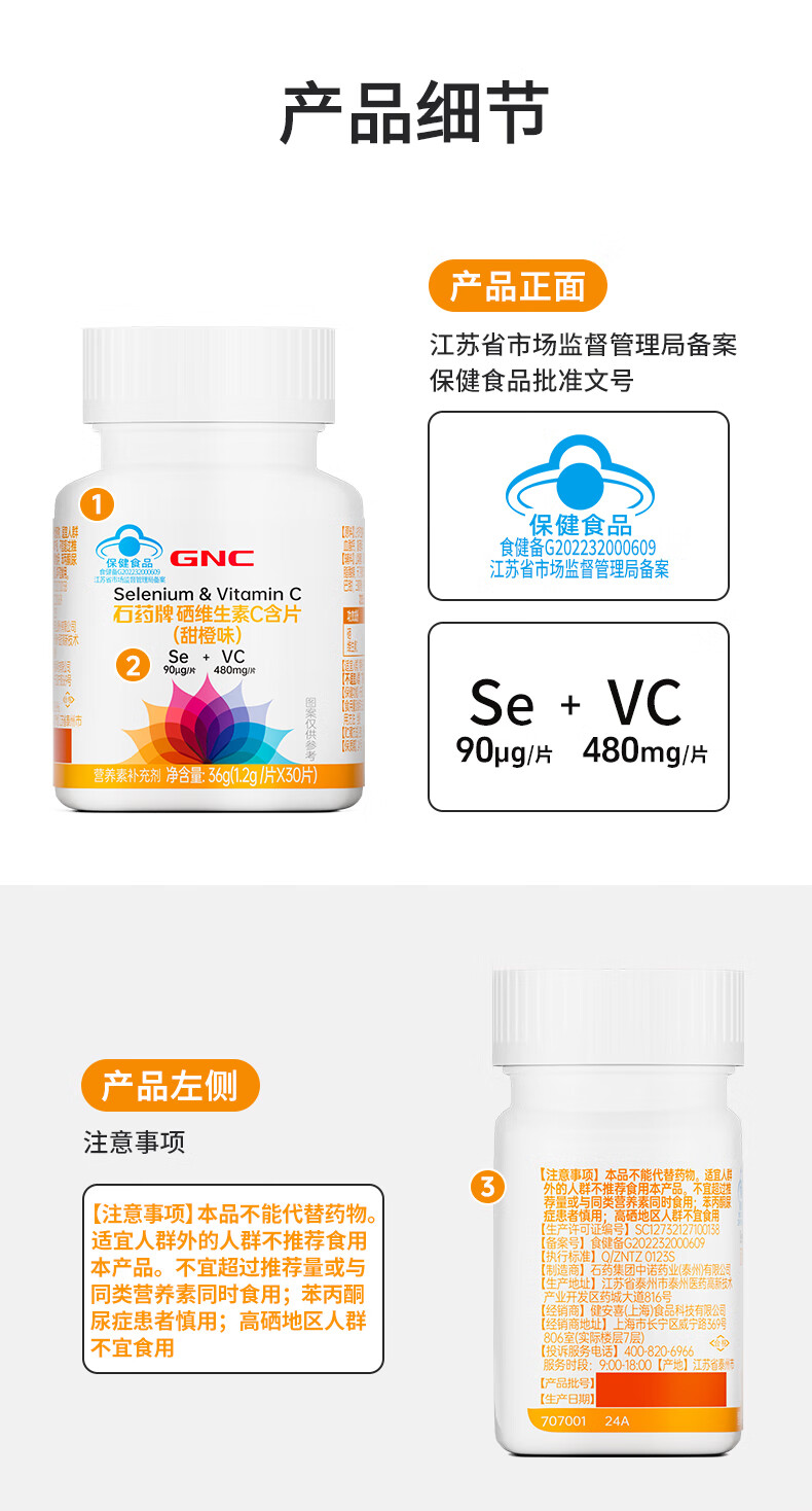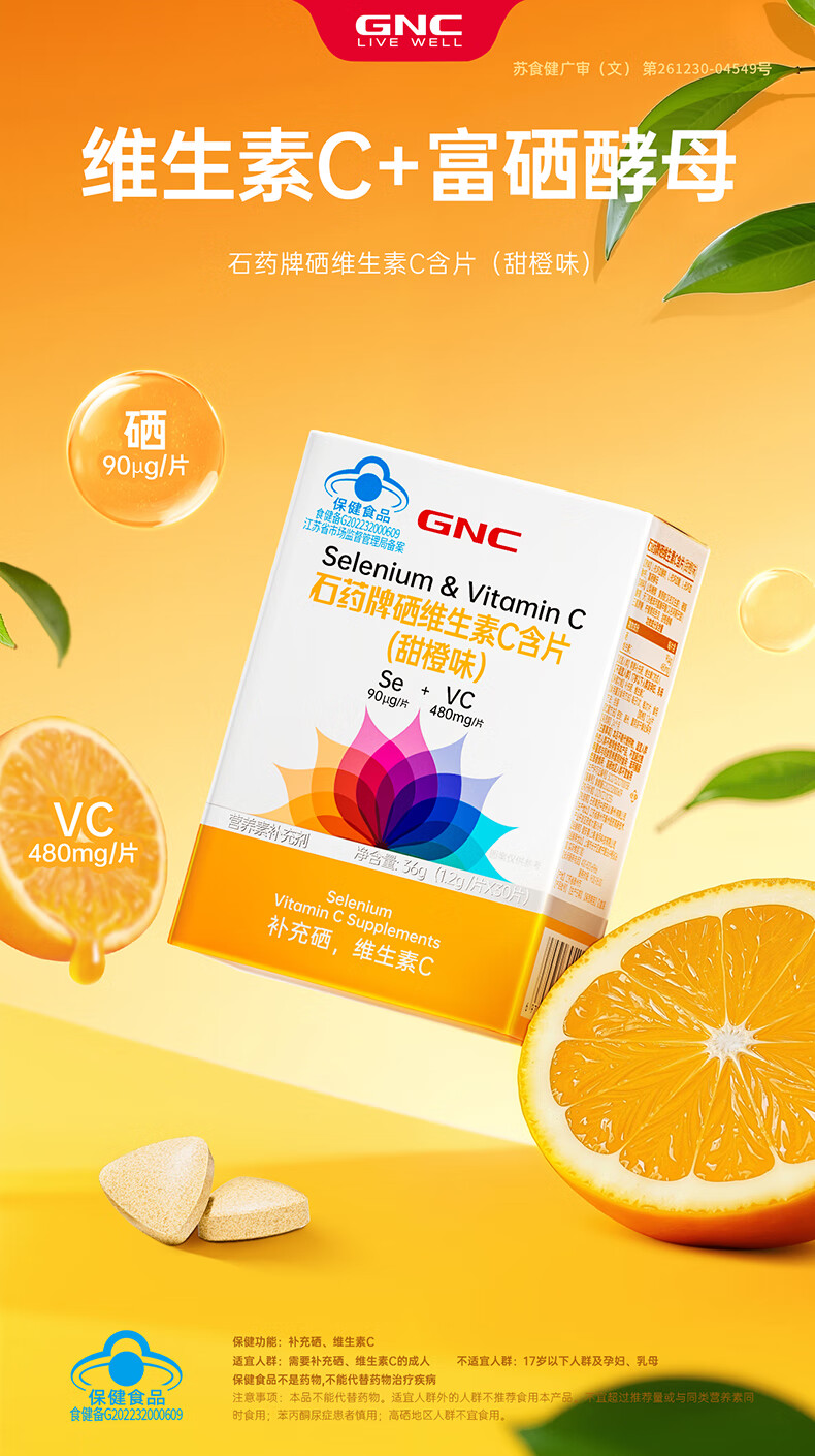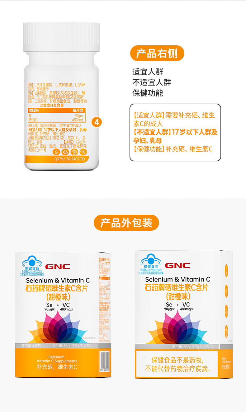 商品名称:(巨邦佑)BJ+GNC健安喜 硒维生素C含片(甜橙味)30片 17岁以上成人补充硒VC
