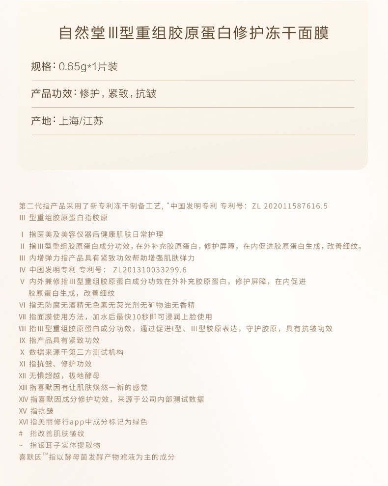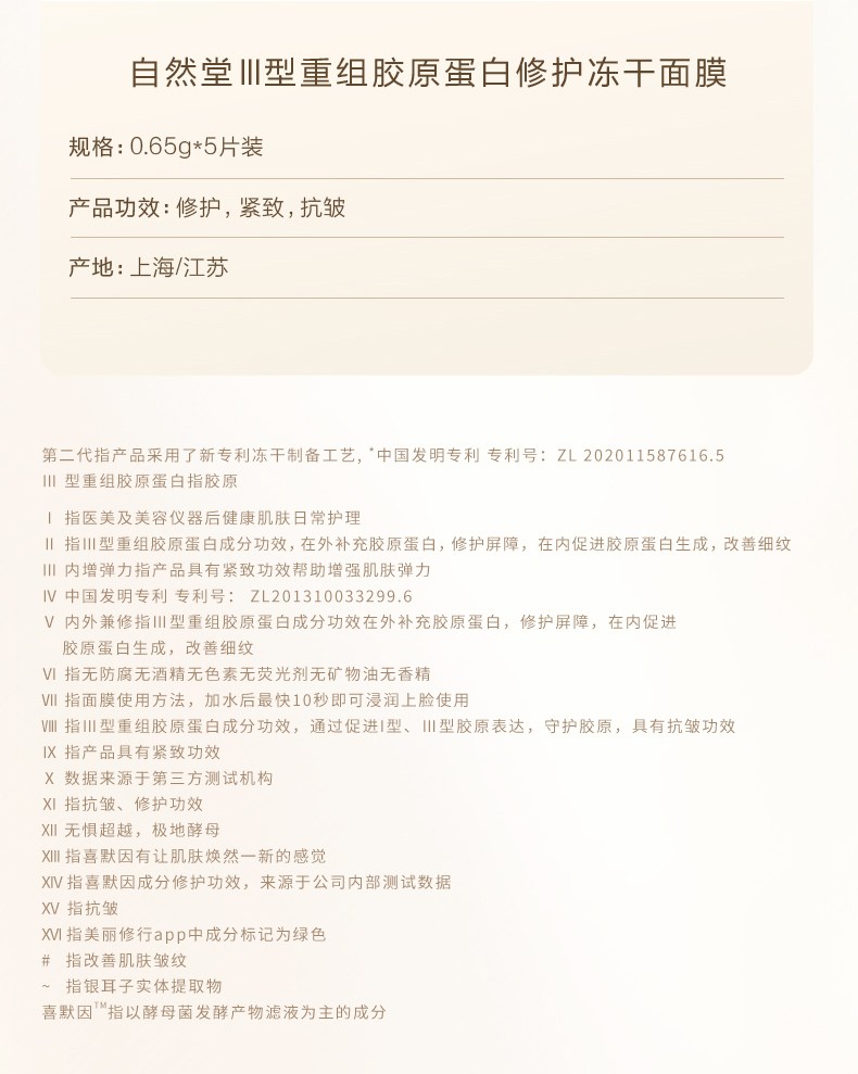 商品名称:(世星阳光)自然堂冻干胶原面膜0.65g×5片 修护抗初老紧致抗皱 敏肌可用