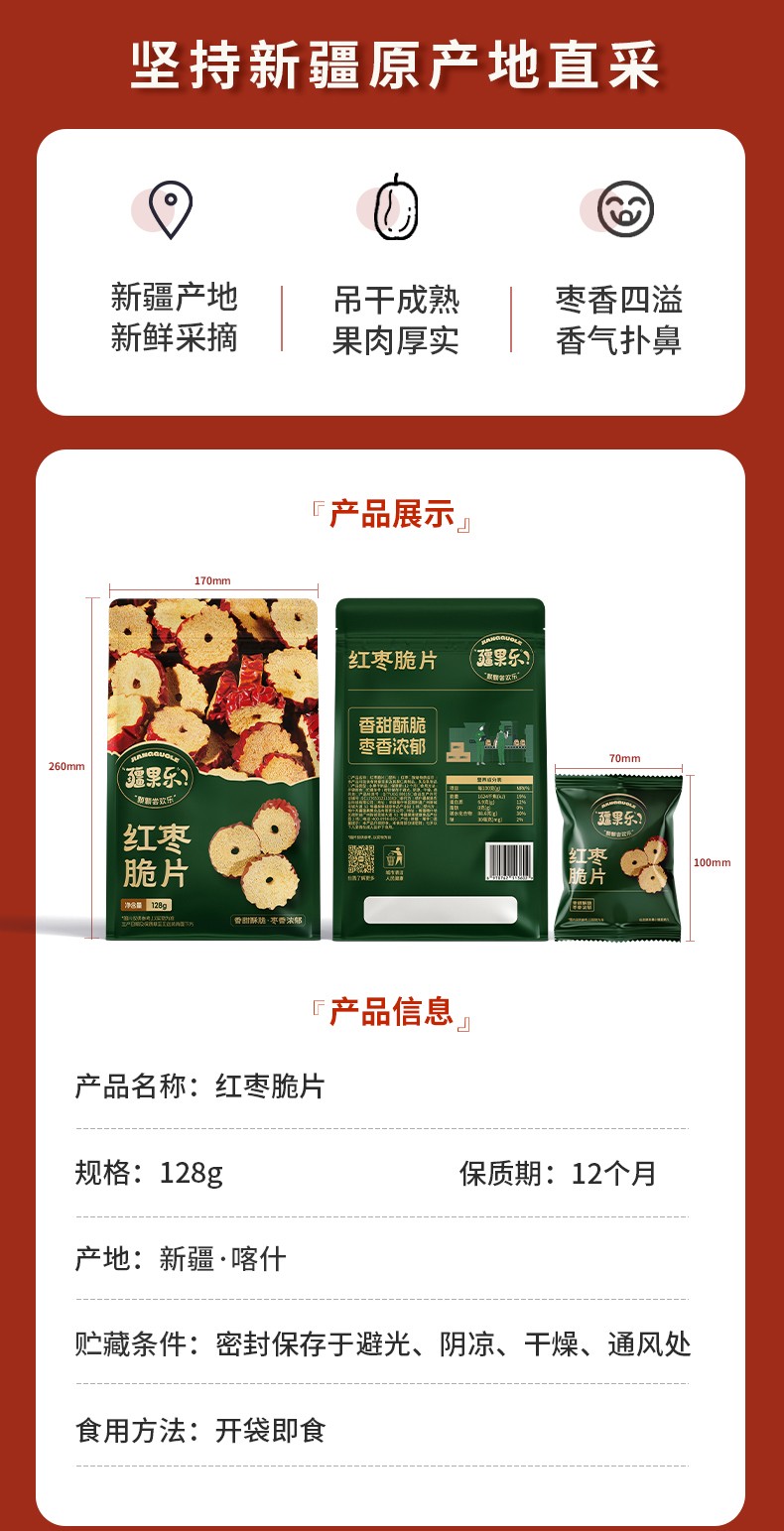 商品名称:(世星阳光) 疆果乐红枣脆片128g 无核枣片红枣干酥脆休闲零食蜜饯果干解馋独立包装