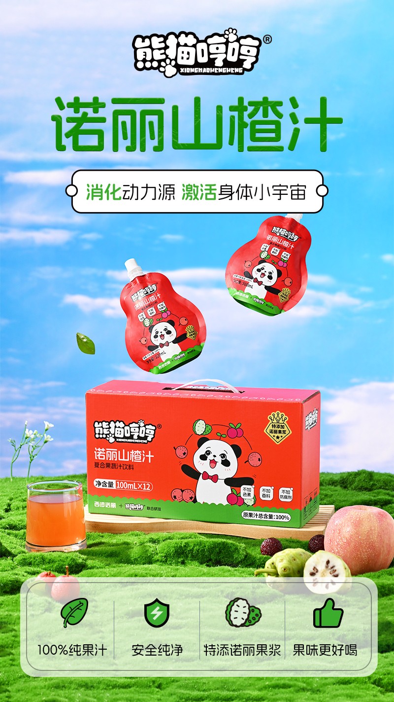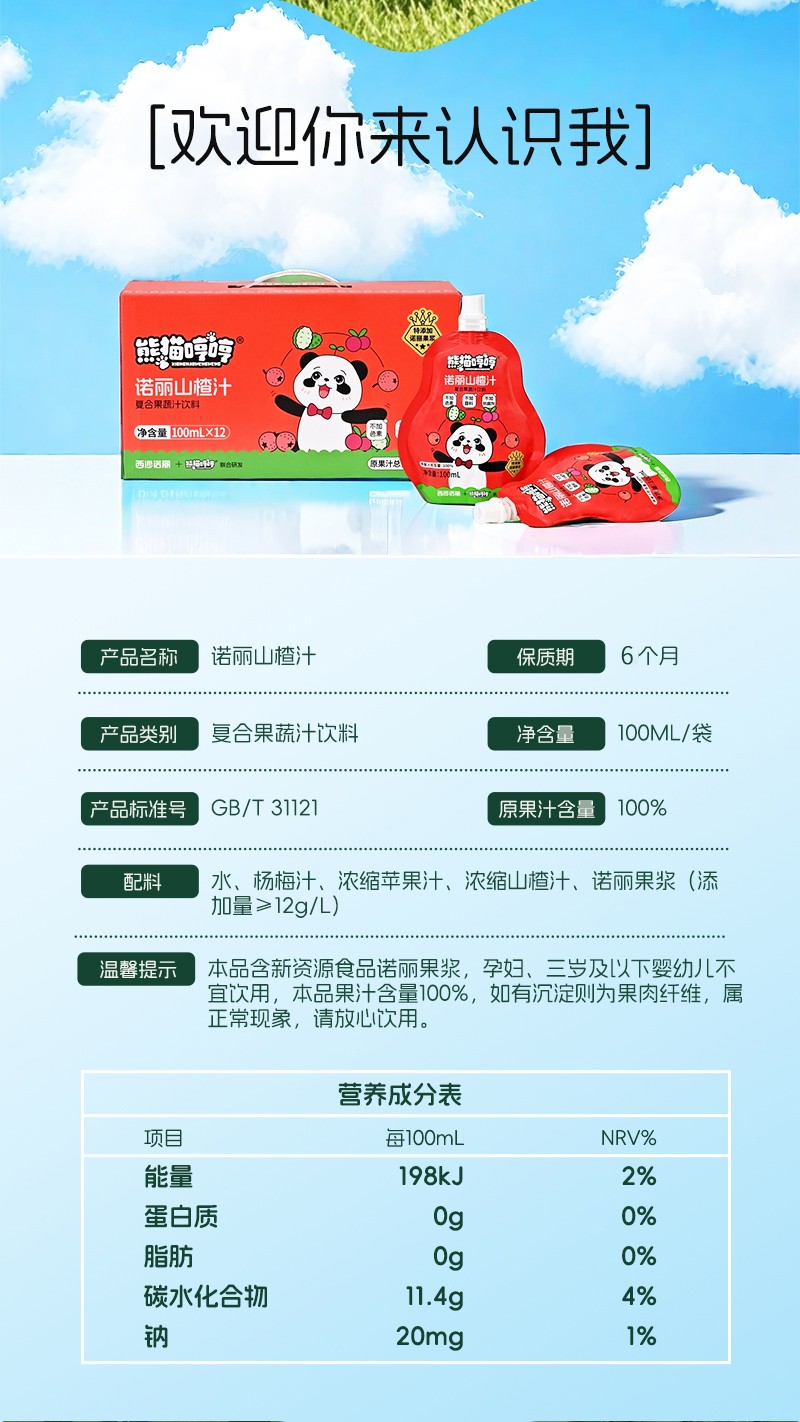商品名称:(巨邦佑)R+熊猫哼哼诺丽山楂汁(100ml*12袋)宝宝儿童果汁饮料非婴幼儿辅食零食3岁+