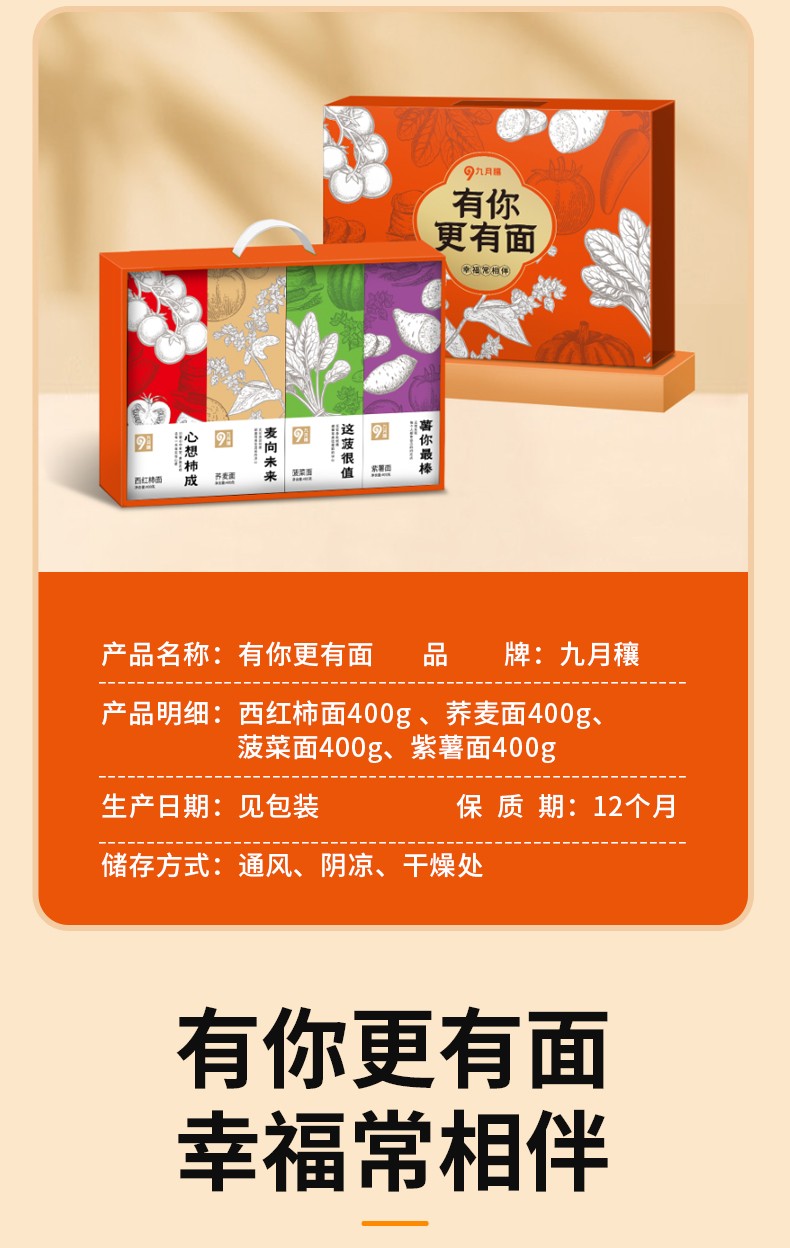 商品名称:(世星阳光)九月穰 有你更有面1.6kg 甄选原料 劲道爽滑 谷蔬面条细面
