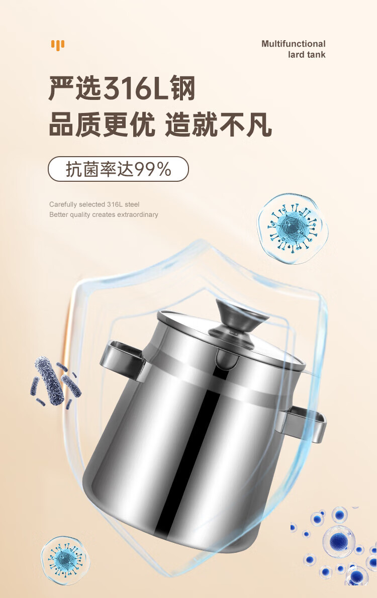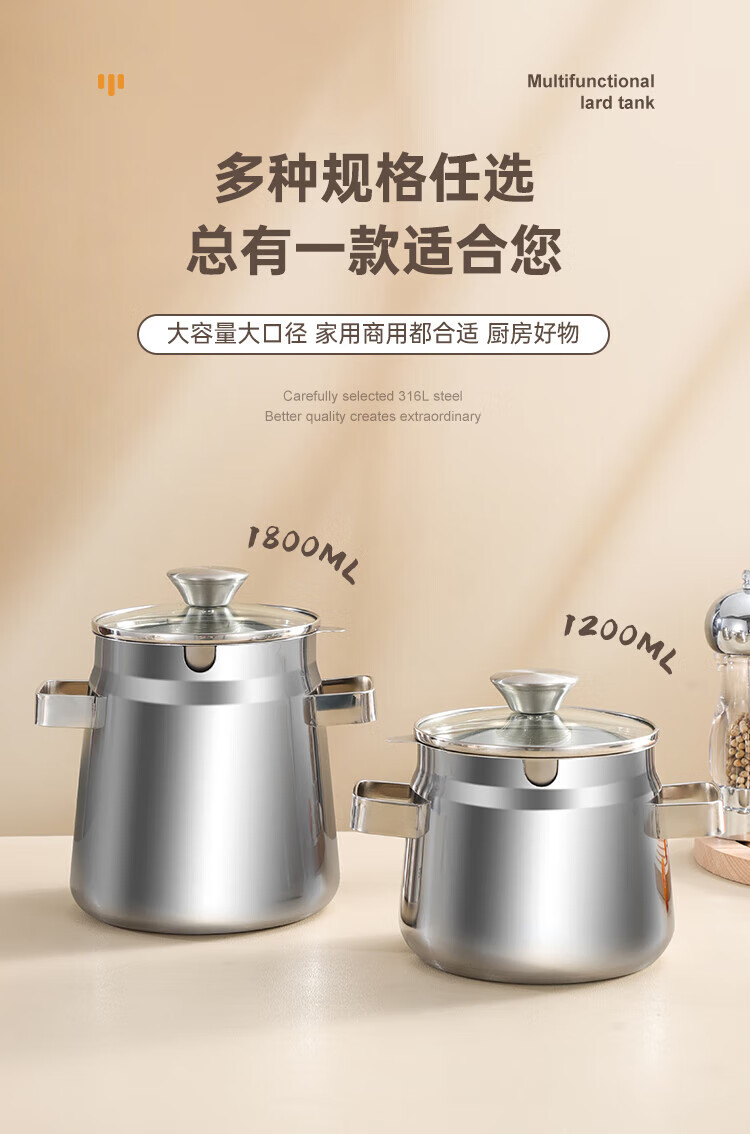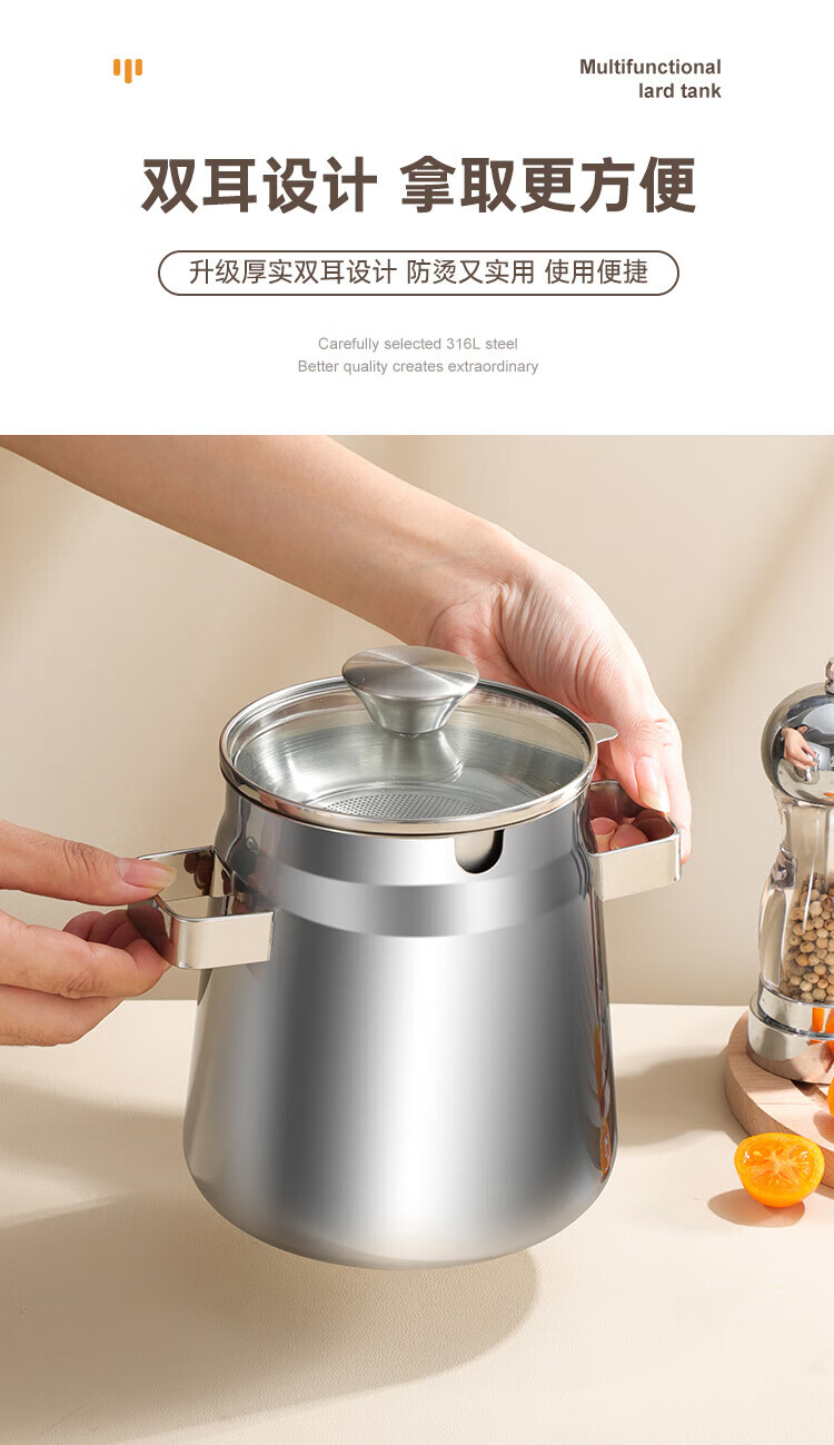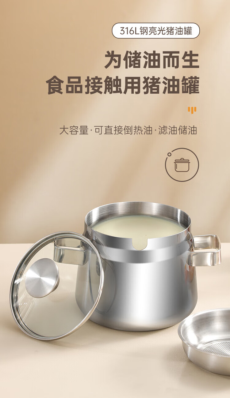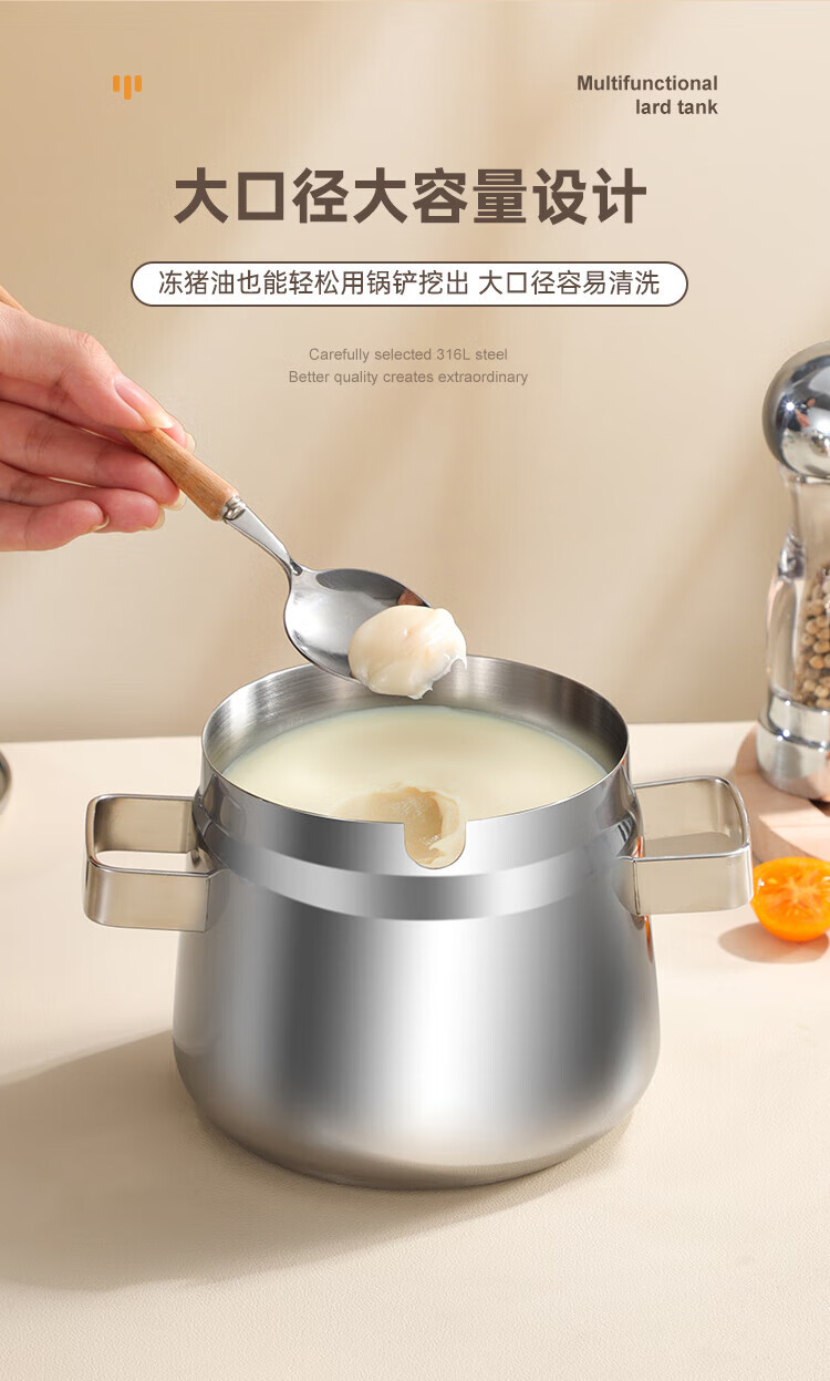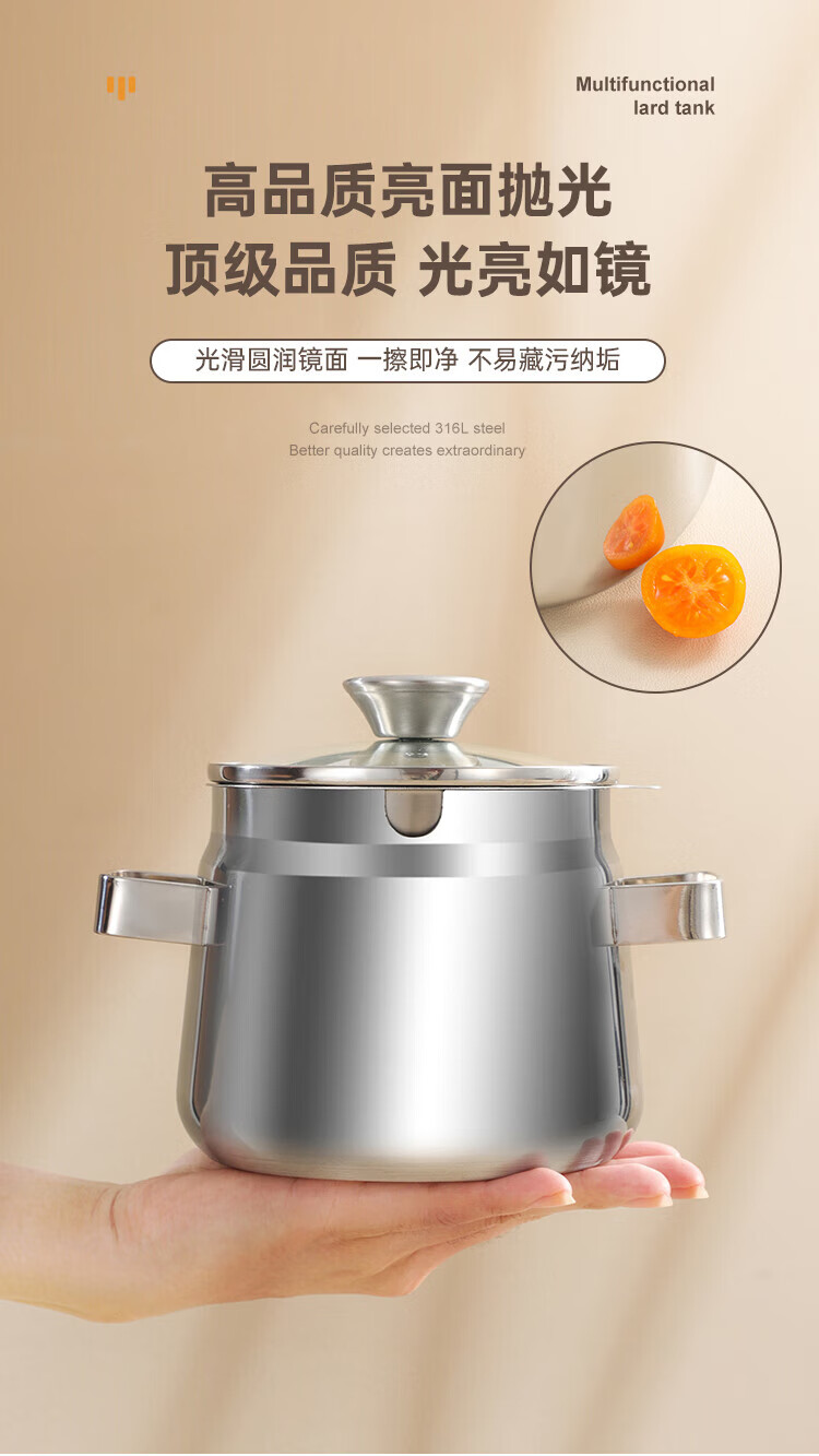 商品名称:(巨邦佑)BJ+物芯质造316L亮光猪油罐 食品接触用猪油罐大容量双耳易端严选316L不锈钢