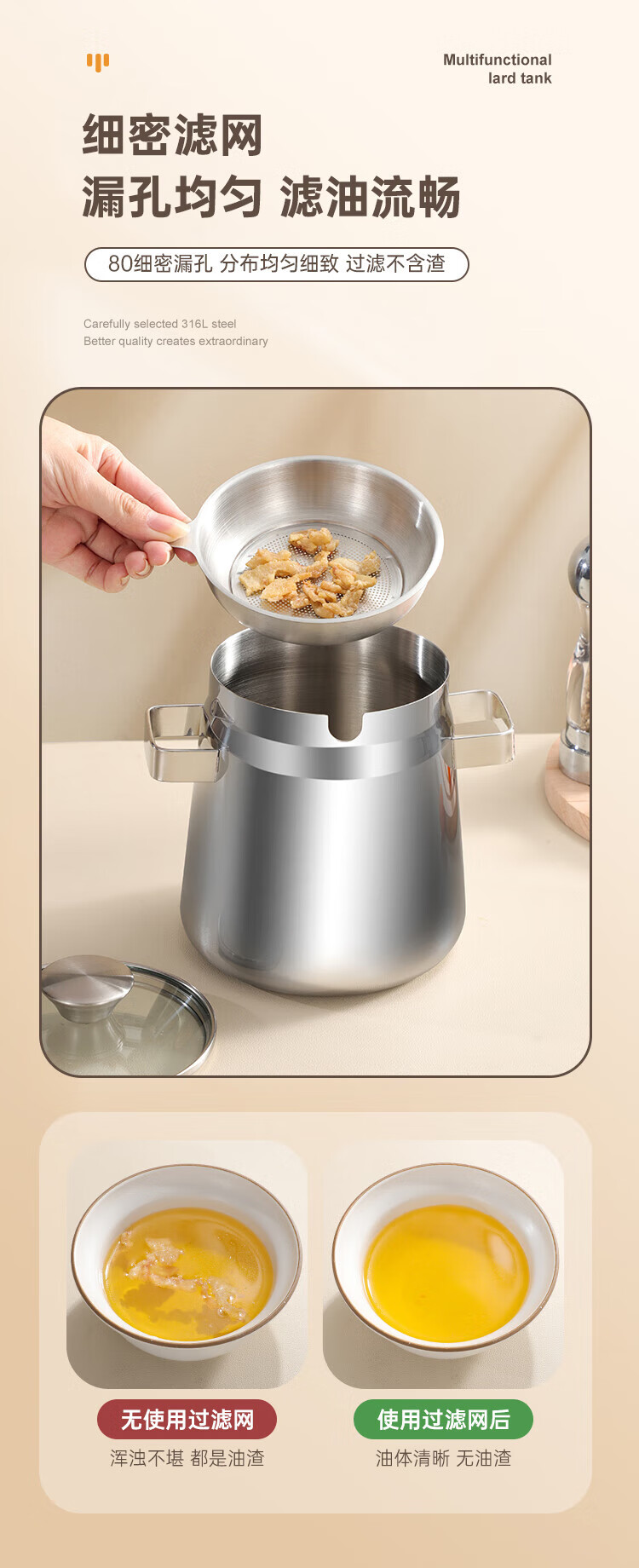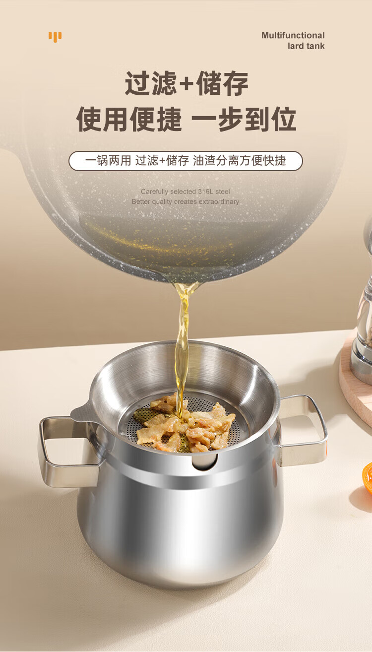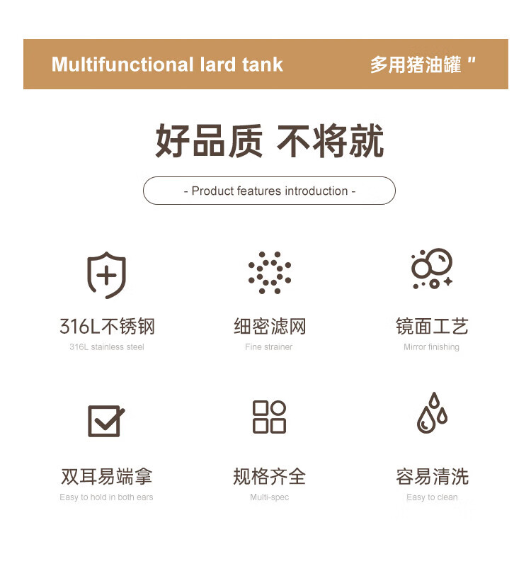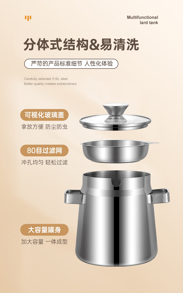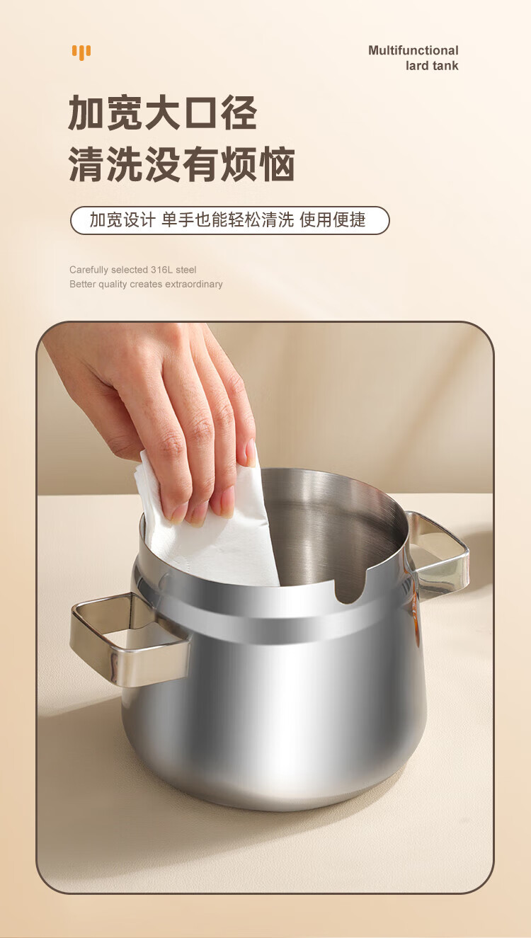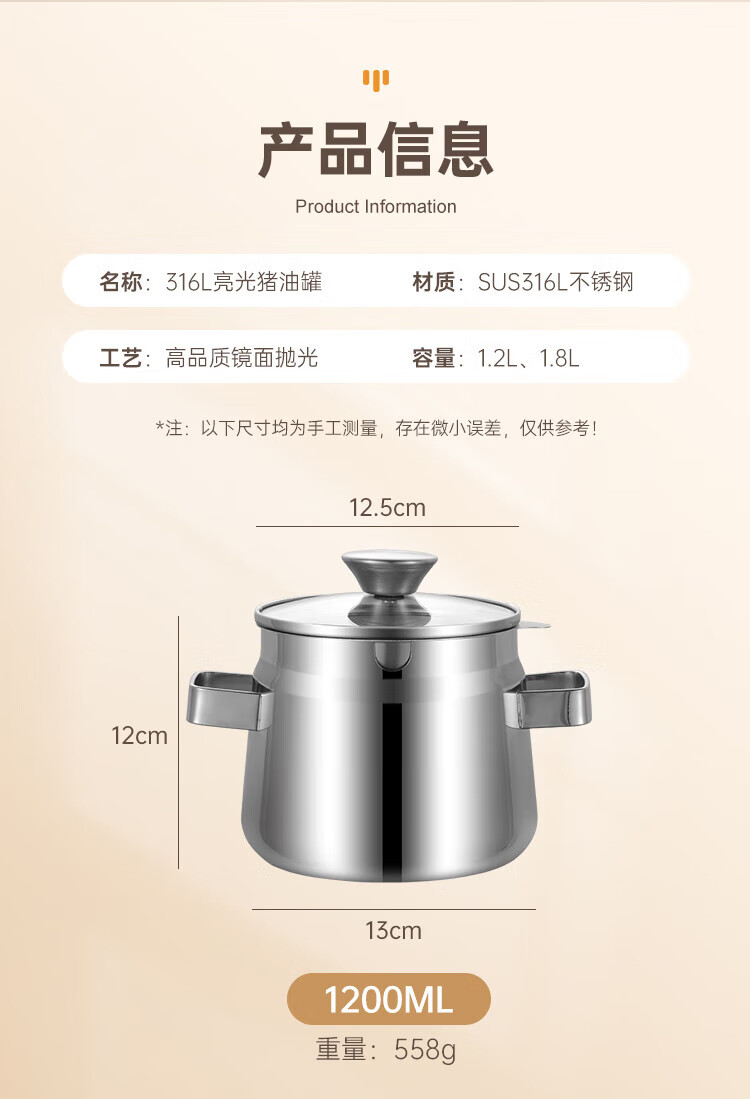 商品名称:(巨邦佑)BJ+物芯质造316L亮光猪油罐 食品接触用猪油罐大容量双耳易端严选316L不锈钢