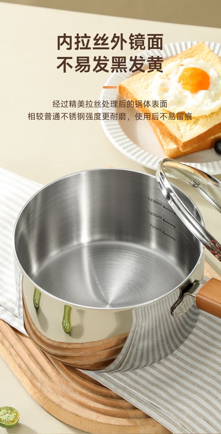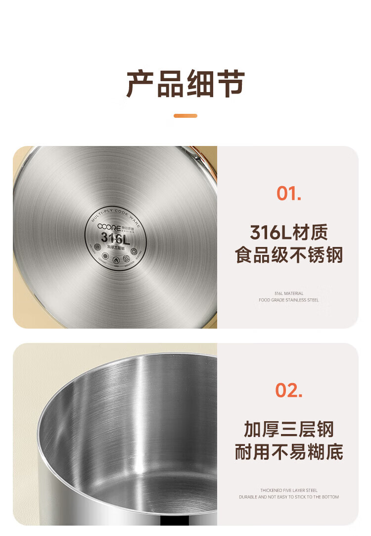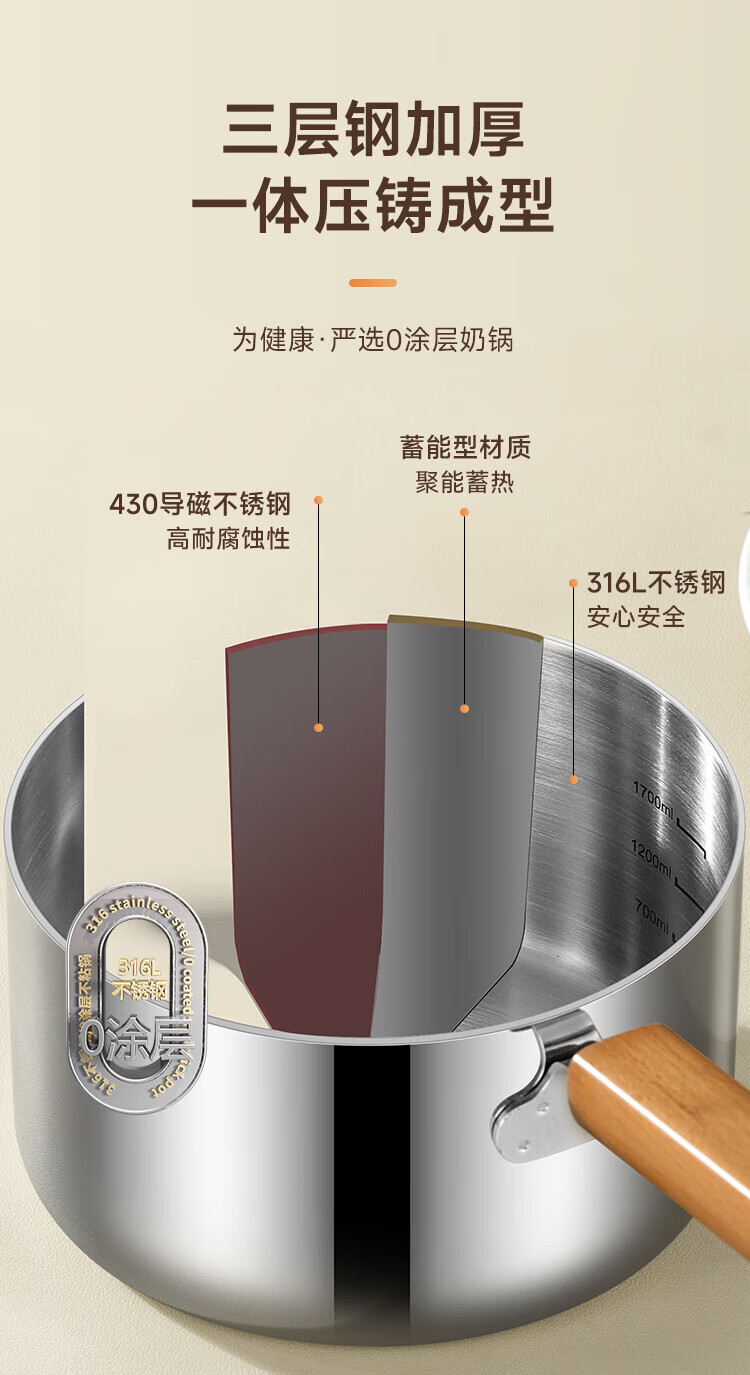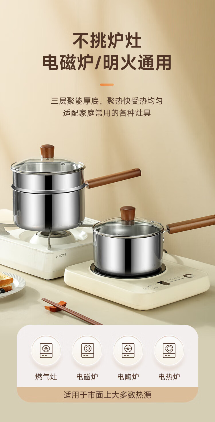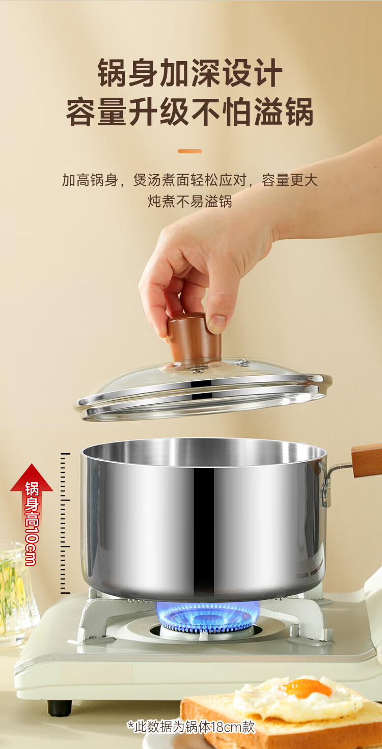 (巨邦佑)BJ+物芯质造赛马Smart 316L多层钢奶锅 带蒸格防烫手柄不锈钢小汤锅易清洗