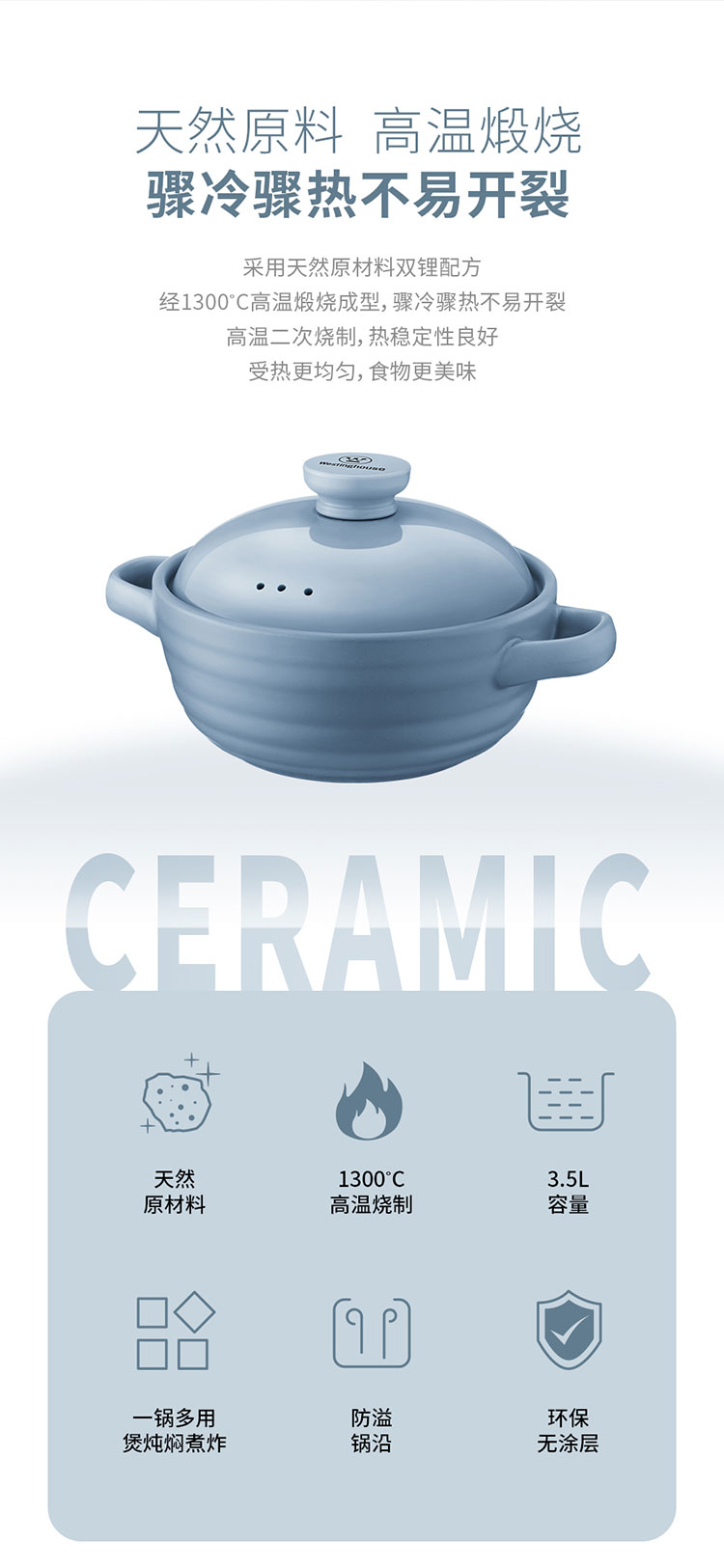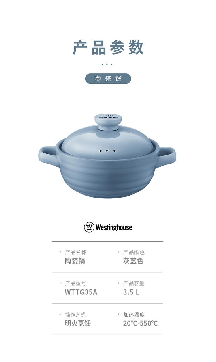 商品名称:(世星阳光)+WY西屋 陶瓷锅 3.5L WTTG35A 骤冷骤热不易开裂 健康 环保 无涂层