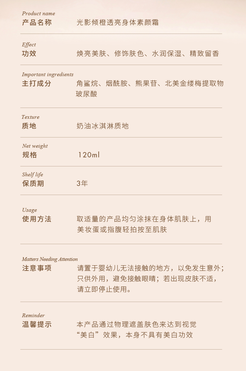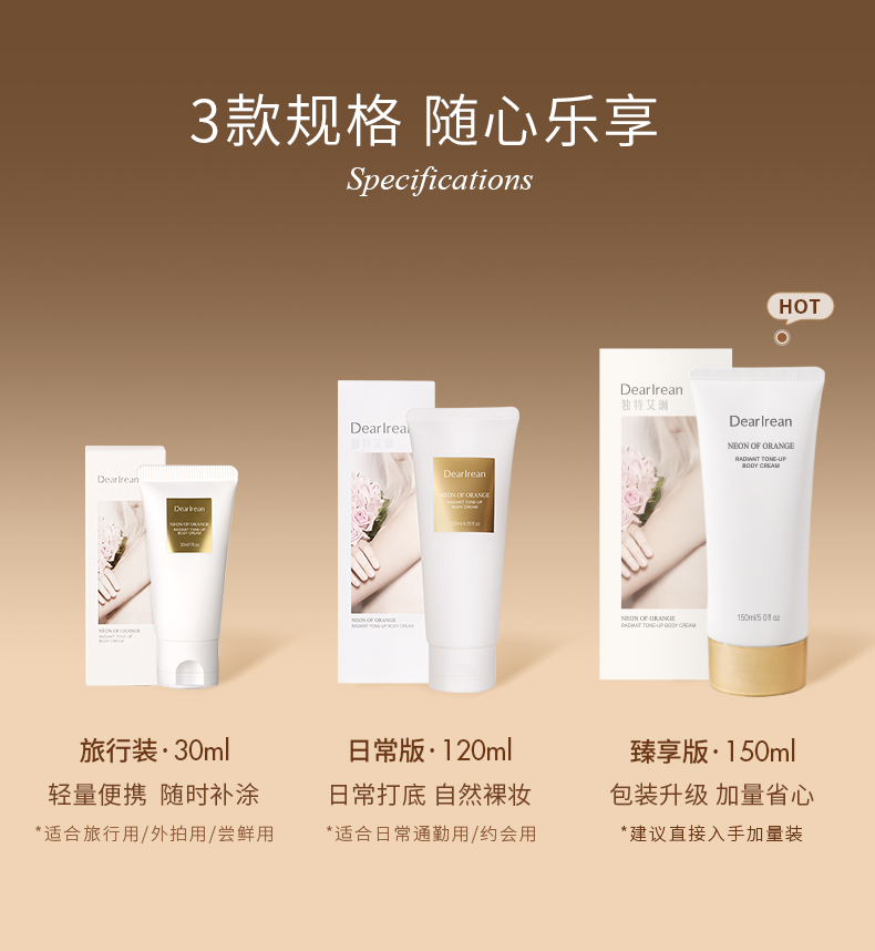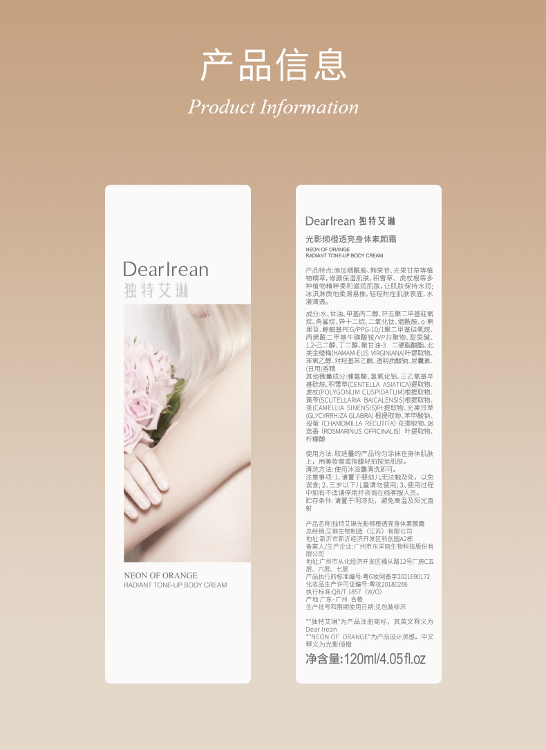 商品名称:(巨邦佑)R+独特艾琳身体素颜霜120ml 光影倾橙 水润保湿不粘腻 自然提亮告别黑黄色差