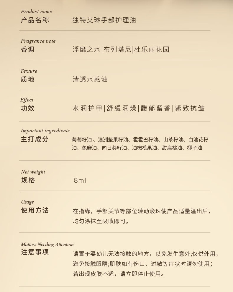 商品名称:(巨邦佑)R+独特艾琳手部精华油8g 护手油护甲油 精华不油腻 补水保湿 防倒刺护甲指缘油送礼 杜乐丽花园【桂花香】