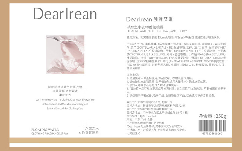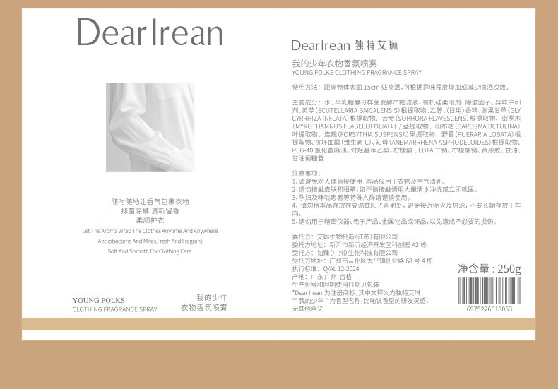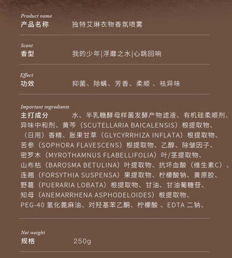 商品名称:(巨邦佑)R+独特艾琳衣服香氛喷雾250g 祛味留香 空气自然香气 羽绒服针织衫净味 【冬季必备】【热销】