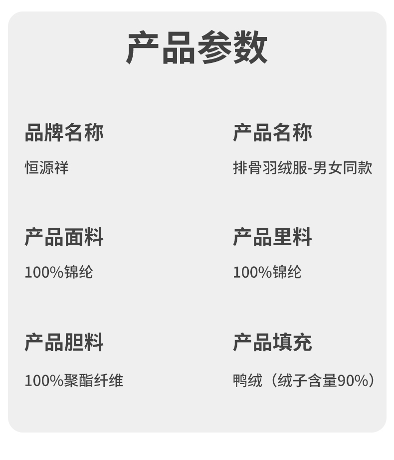 商品名称:(世星阳光)+恒源祥 排骨羽绒服 男女同款 琥珀黑HYX221YRF 规格 S-4XL 下单请备注尺码 立体剪裁 聚热保暖