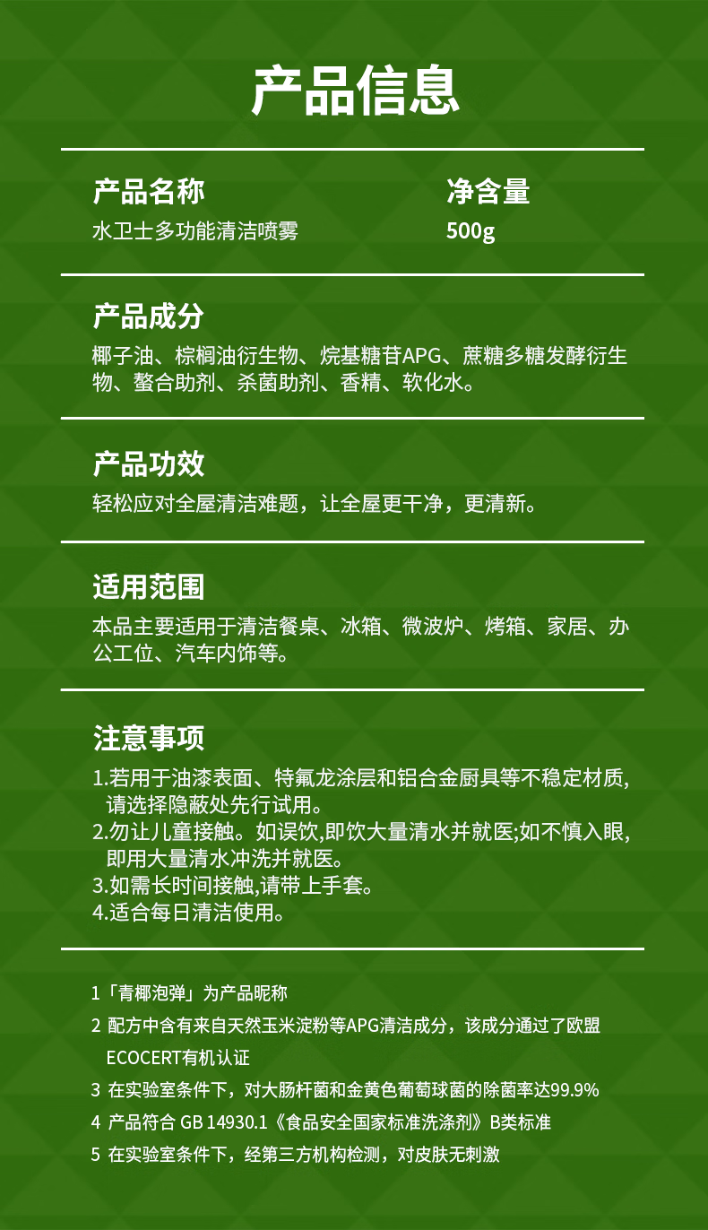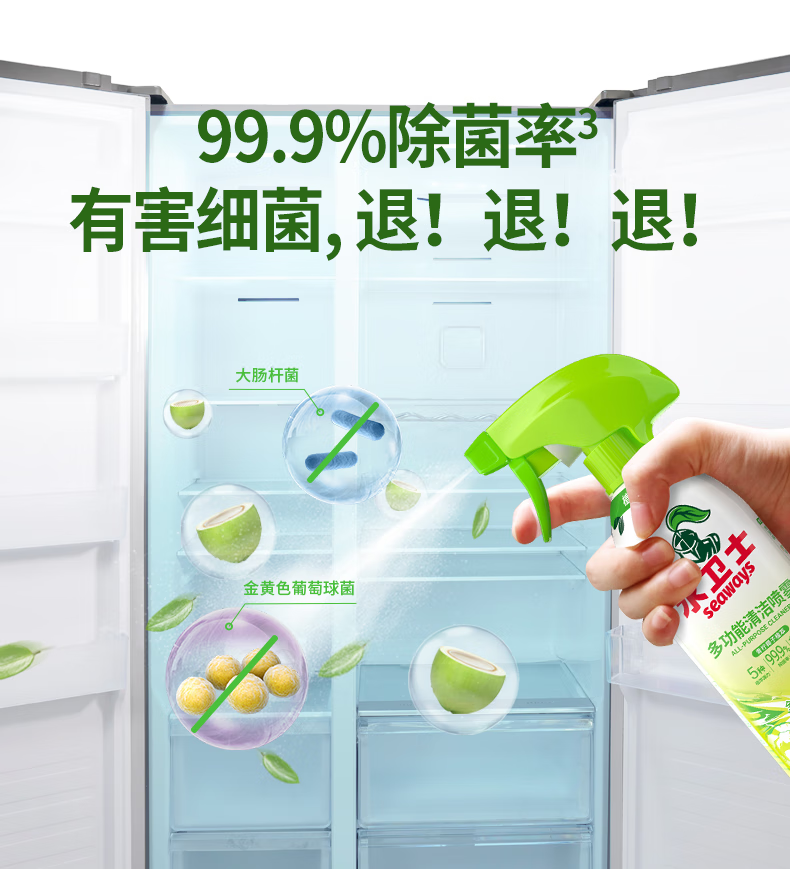 商品名称:(世星阳光) 水卫士 多功能清洁喷雾*3瓶(喷头*1)+厨房重油污净*1瓶(喷头*1) 5重植萃净护力 一招击退污垢