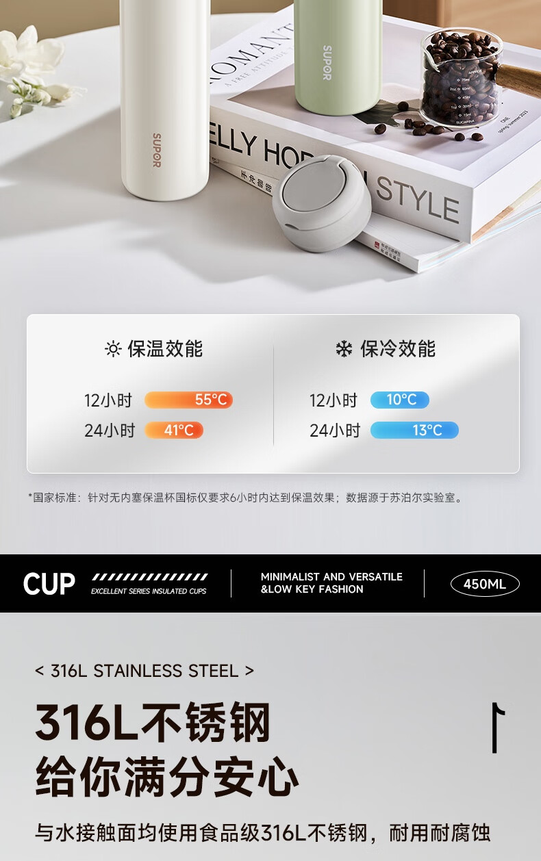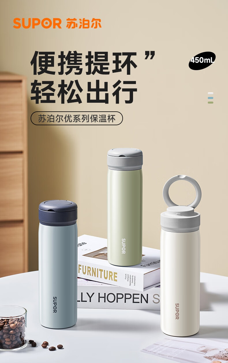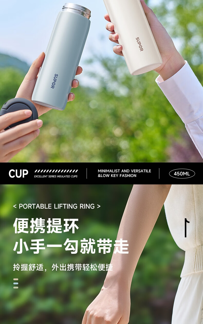 (巨邦佑)BJ+苏泊尔(SUPOR) 优系列保温杯 450ml KCV45BC10 速开双饮保温杯大容量便携男女士学生户外健身运动骑行水杯子