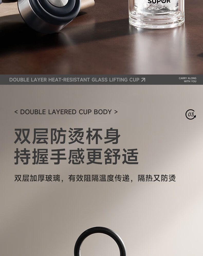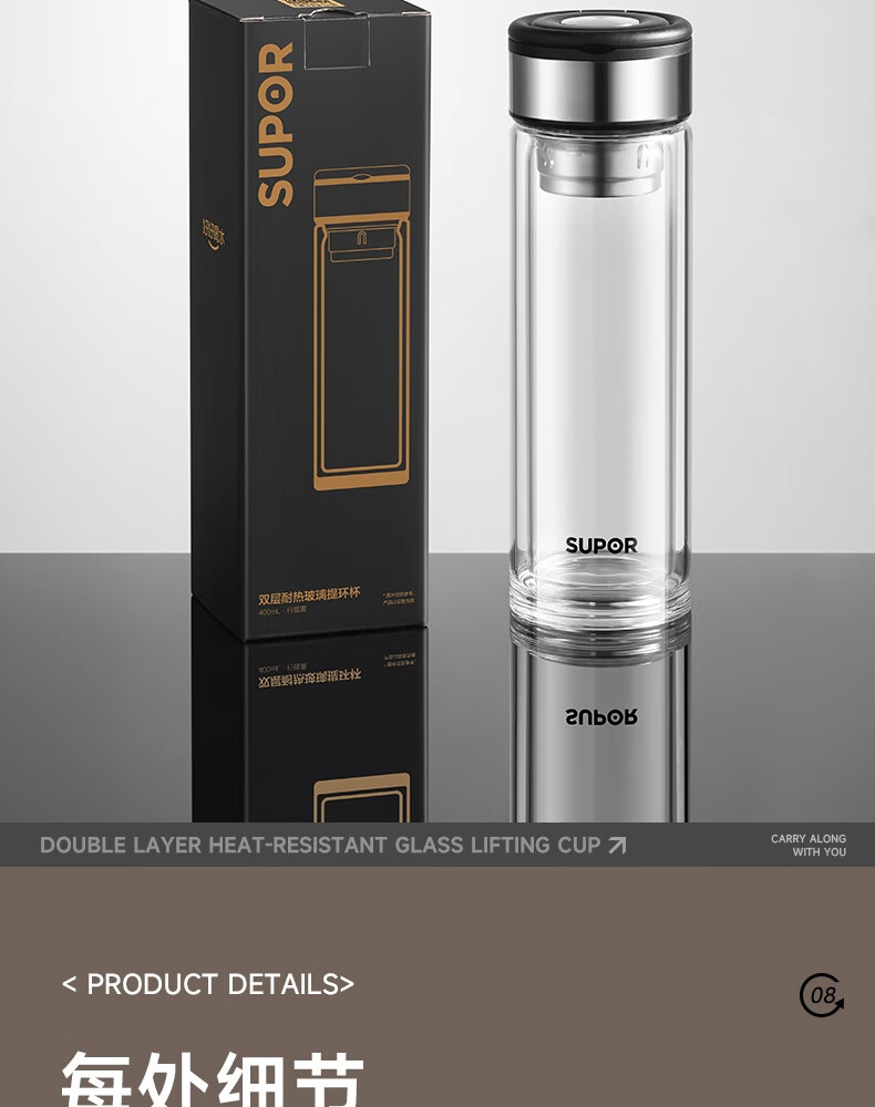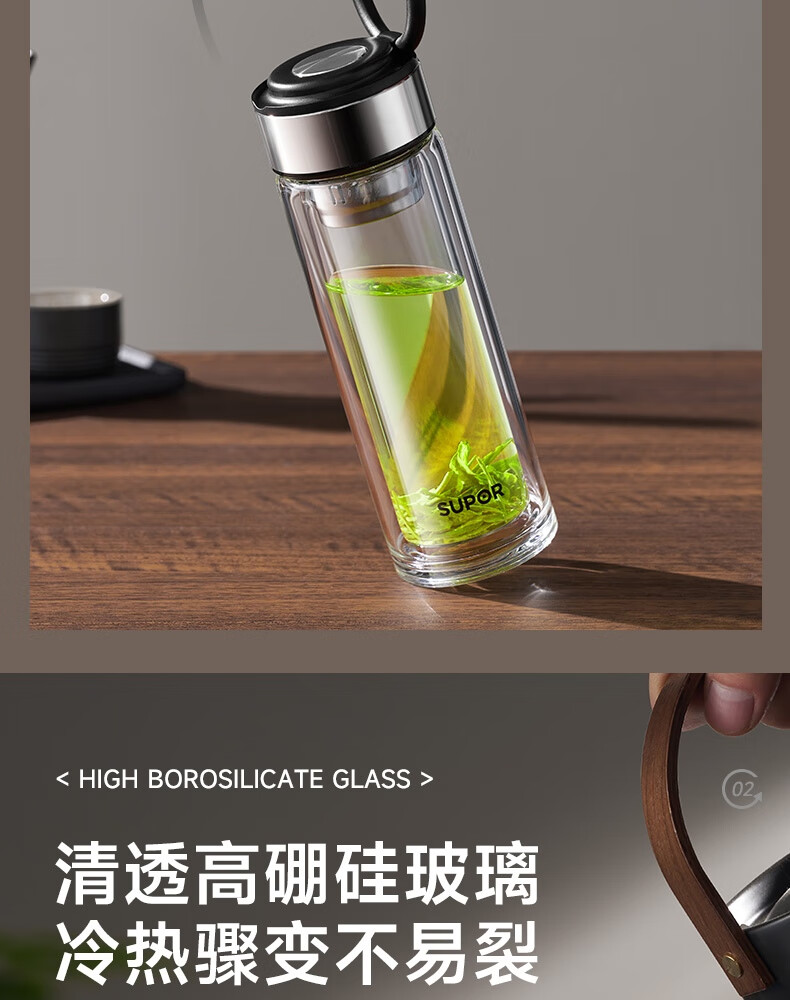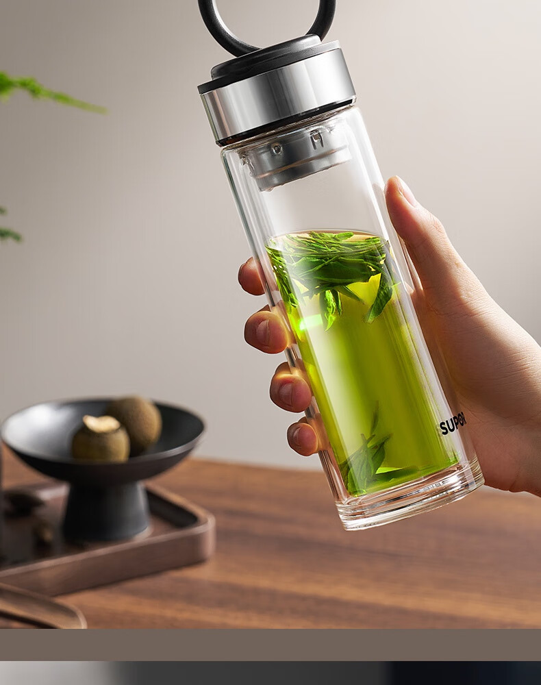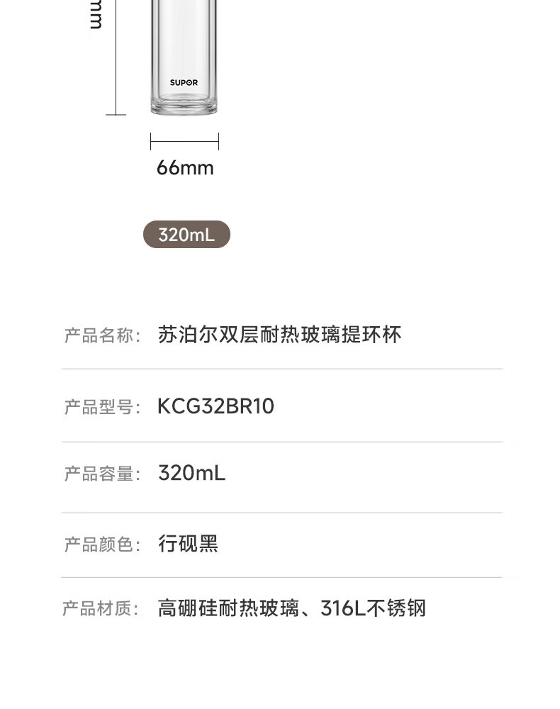 商品名称:(巨邦佑)BJ+苏泊尔(SUPOR)双层耐热玻璃提环杯320ml KCG32BR10 水杯男女过滤泡茶杯子