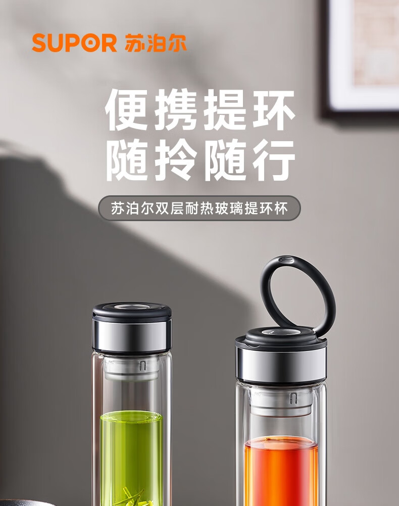 (巨邦佑)BJ+苏泊尔(SUPOR)双层耐热玻璃提环杯320ml KCG32BR10 水杯男女过滤泡茶杯子