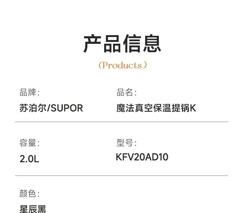 商品名称:(巨邦佑)BJ+苏泊尔(SUPOR)魔法真空保温提锅 2L KFV20AD10 直型防溢304不锈钢三层饭盒保温桶