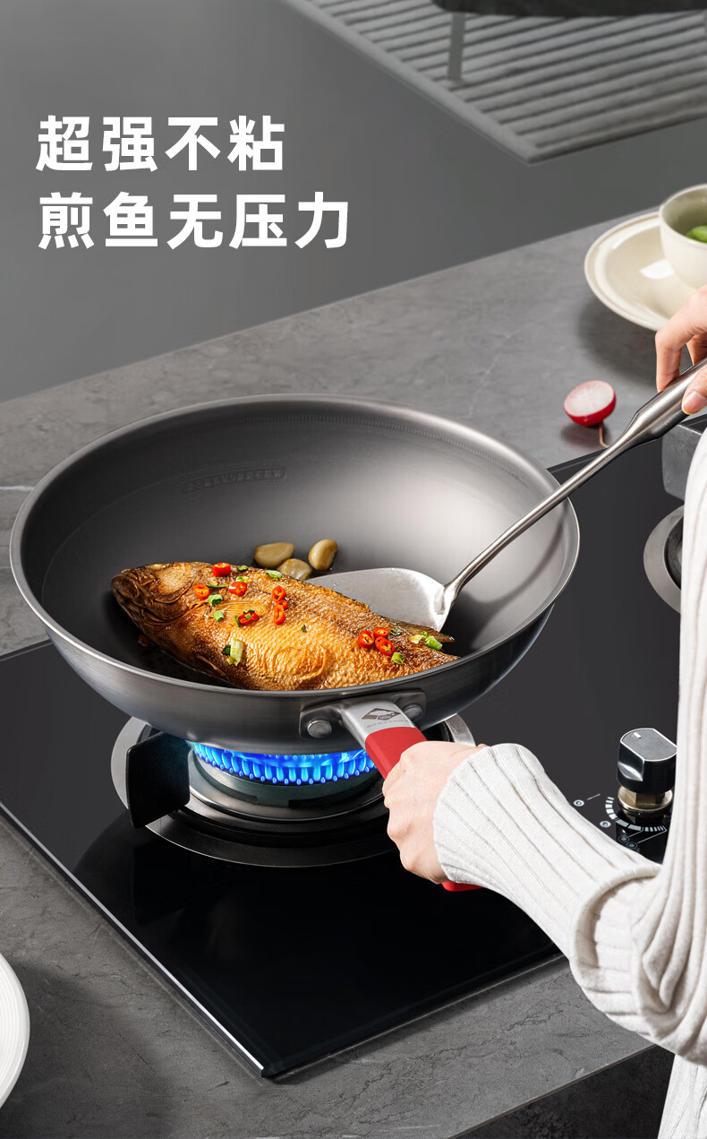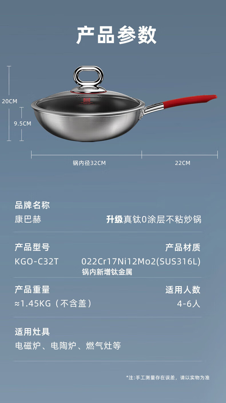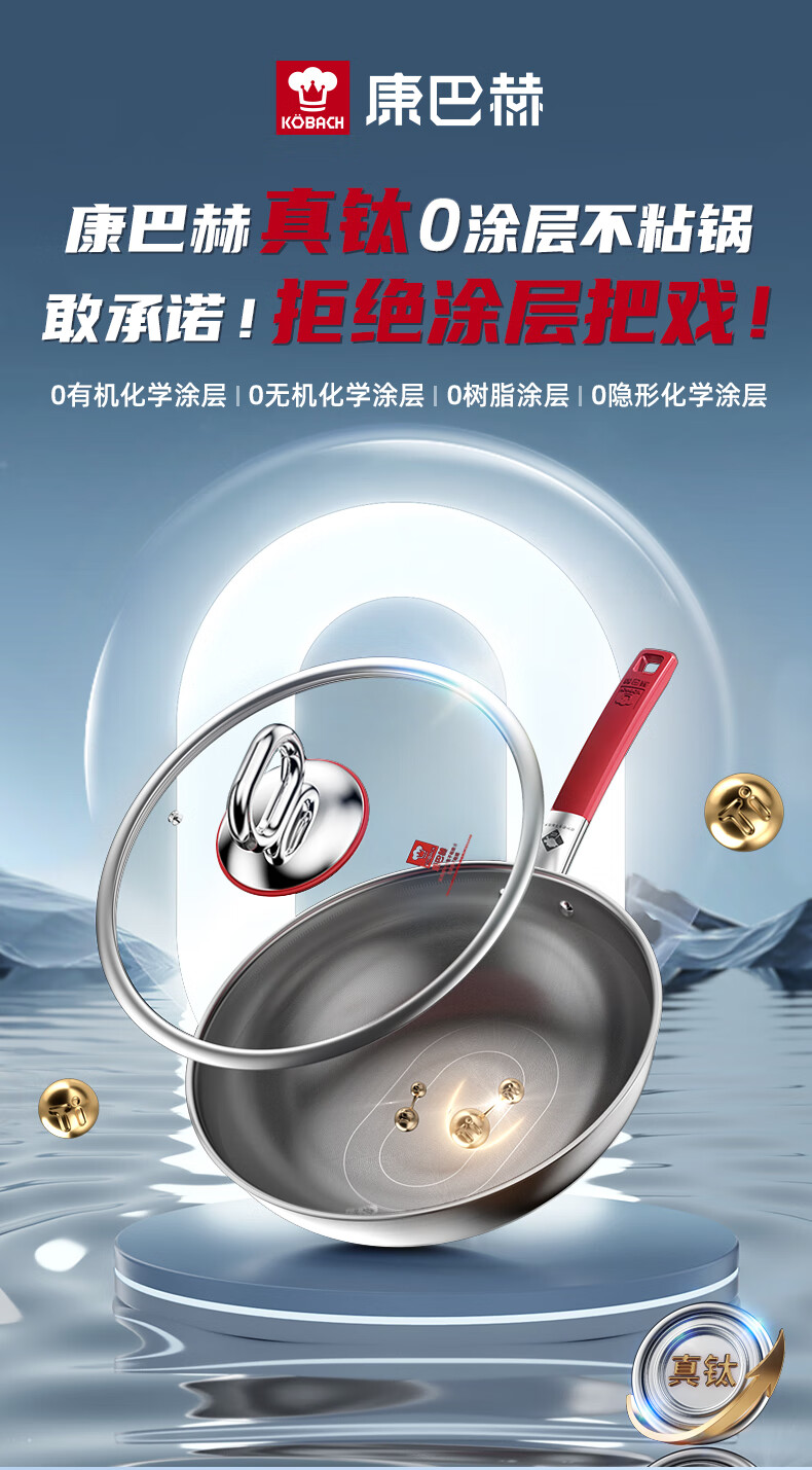 (巨邦佑)BJ+康巴赫(KBH)真钛0涂层不粘炒锅第三代32cm KGO-C32T 0涂层抗菌炒锅无涂层316L不锈钢炒菜锅电磁炉燃气通用