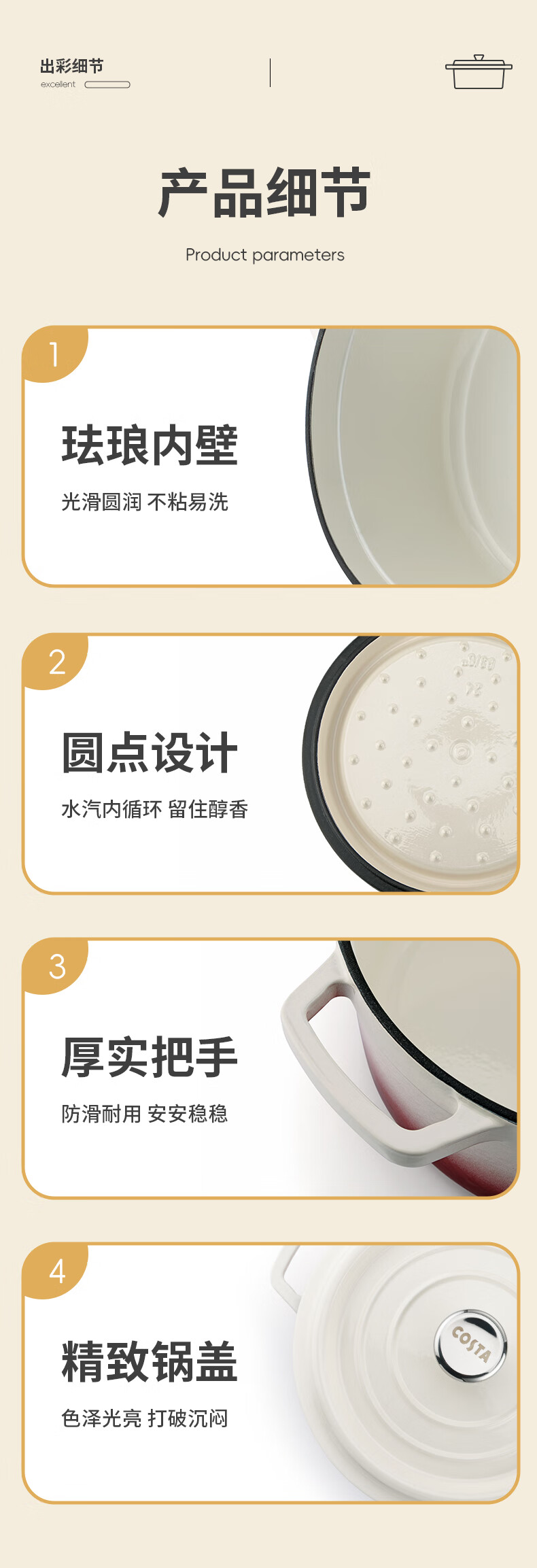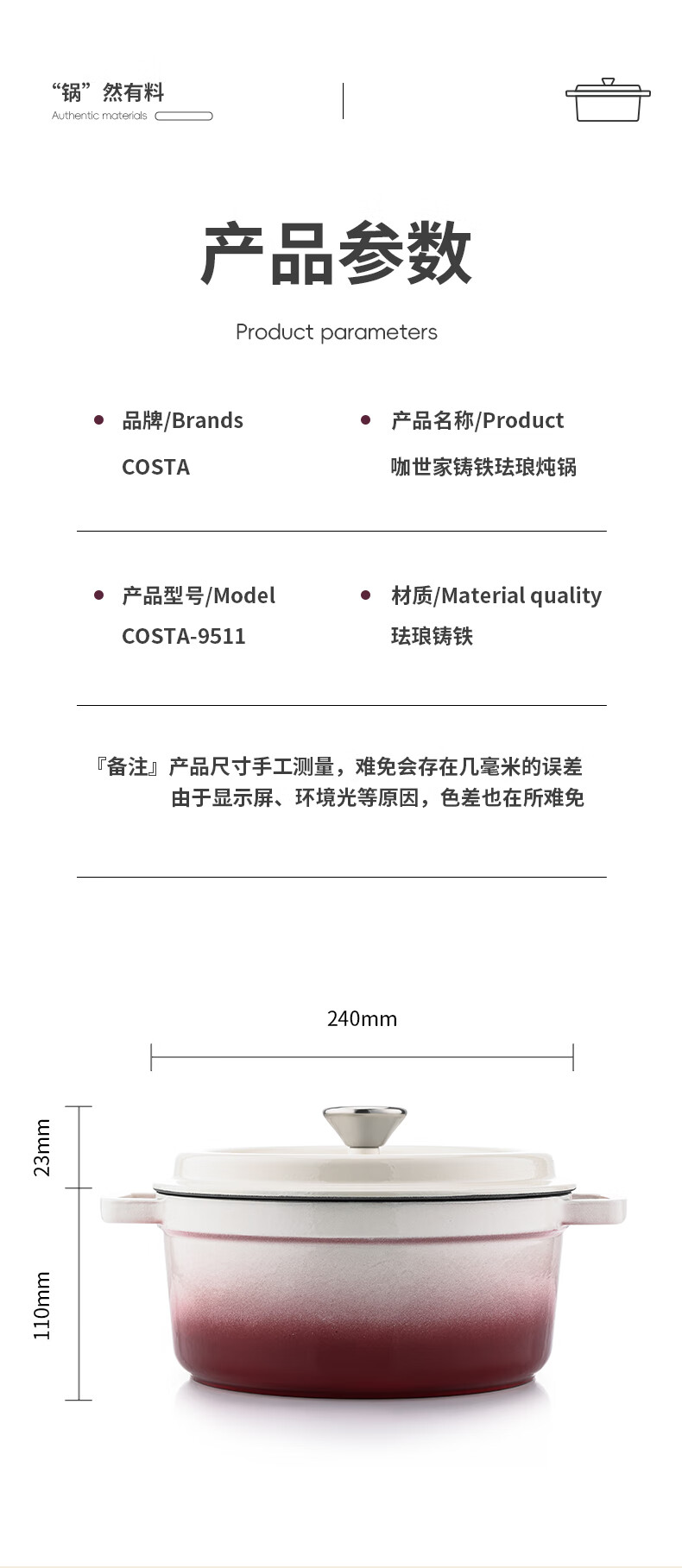 商品名称:(巨邦佑)BJ+COSTA 咖世家铸铁珐琅炖锅 COSTA -9511 珐琅内壁厚实把手
