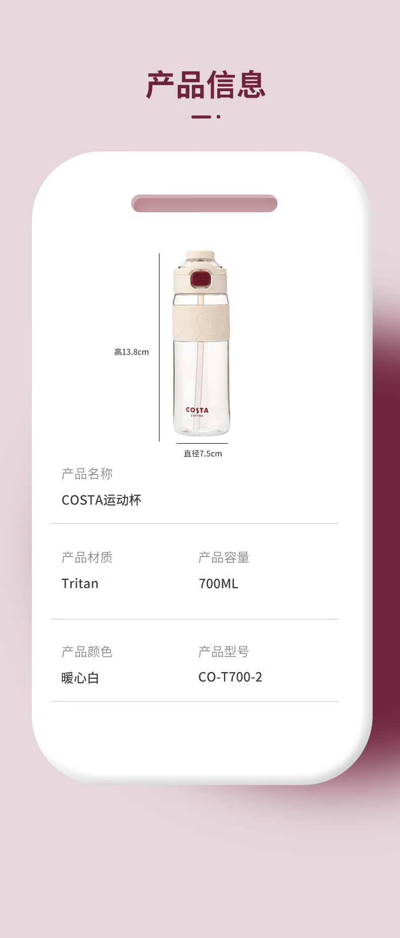 商品名称:(巨邦佑)BJ+COSTA 运动杯 700ml CO-T700-2 杯身轻盈出行方便便携杯子